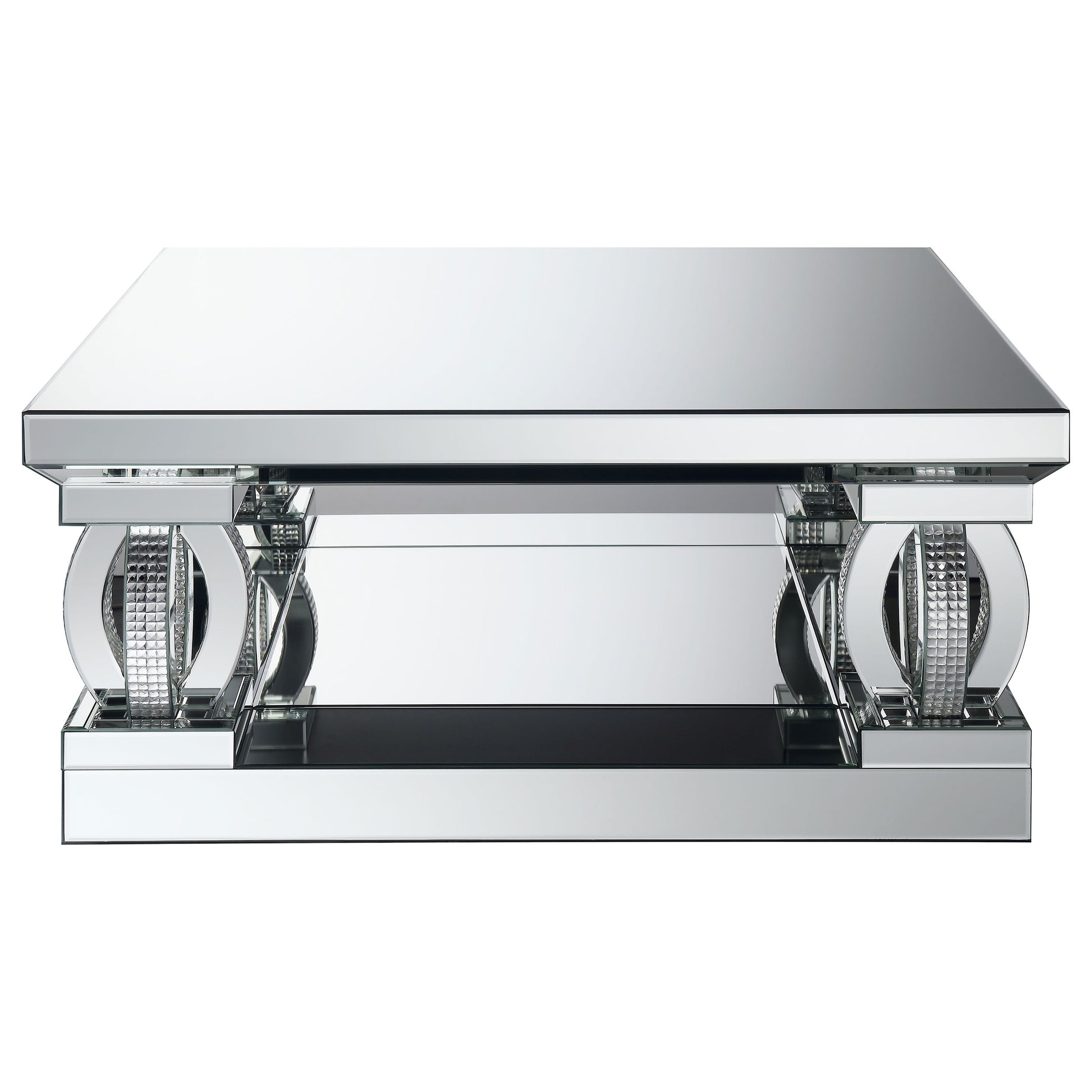 This 40-inch square coffee table brings bold, contemporary style to your living space. With its mirrored surfaces and sturdy construction, it features a large, symmetrical top and matching base for visual balance. Sculptural, oval-shaped supports adorned with rhinestone accents create a glamorous, three-dimensional design. Perfect for displaying decor or hosting guests, this coffee table blends modern luxury with timeless elegance, making it a captivating centerpiece in any living room.