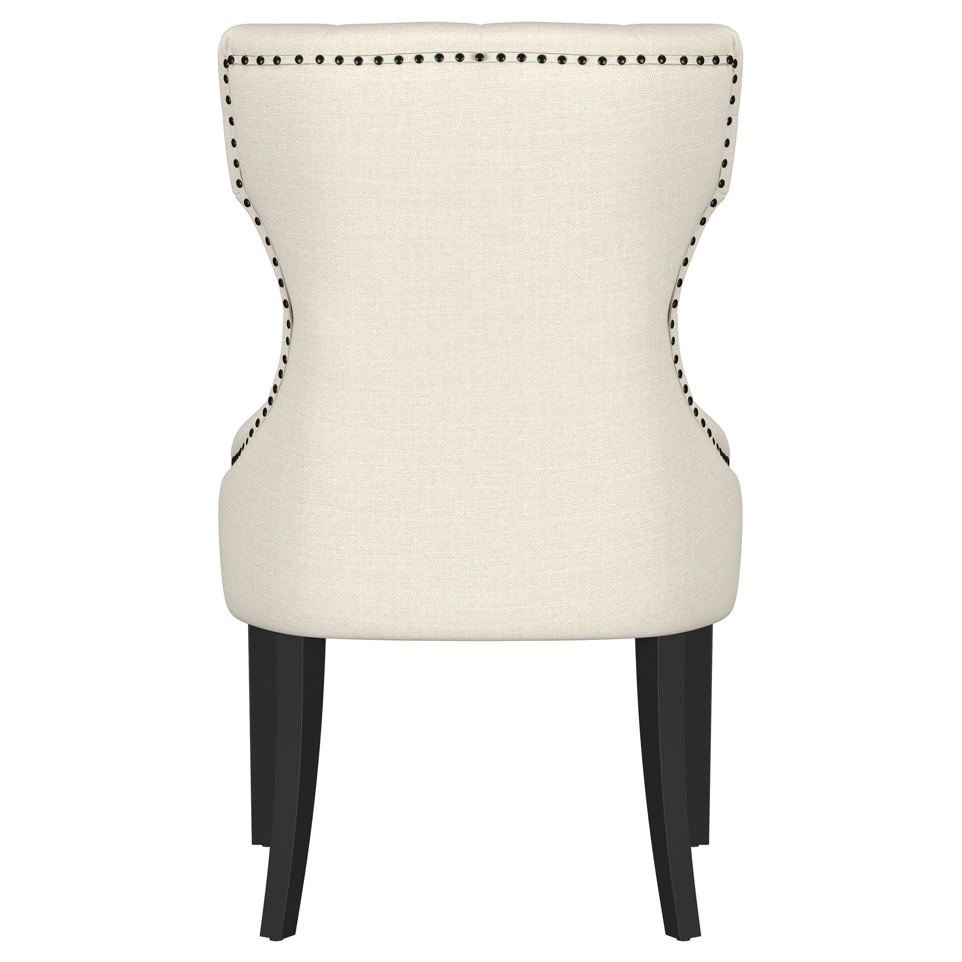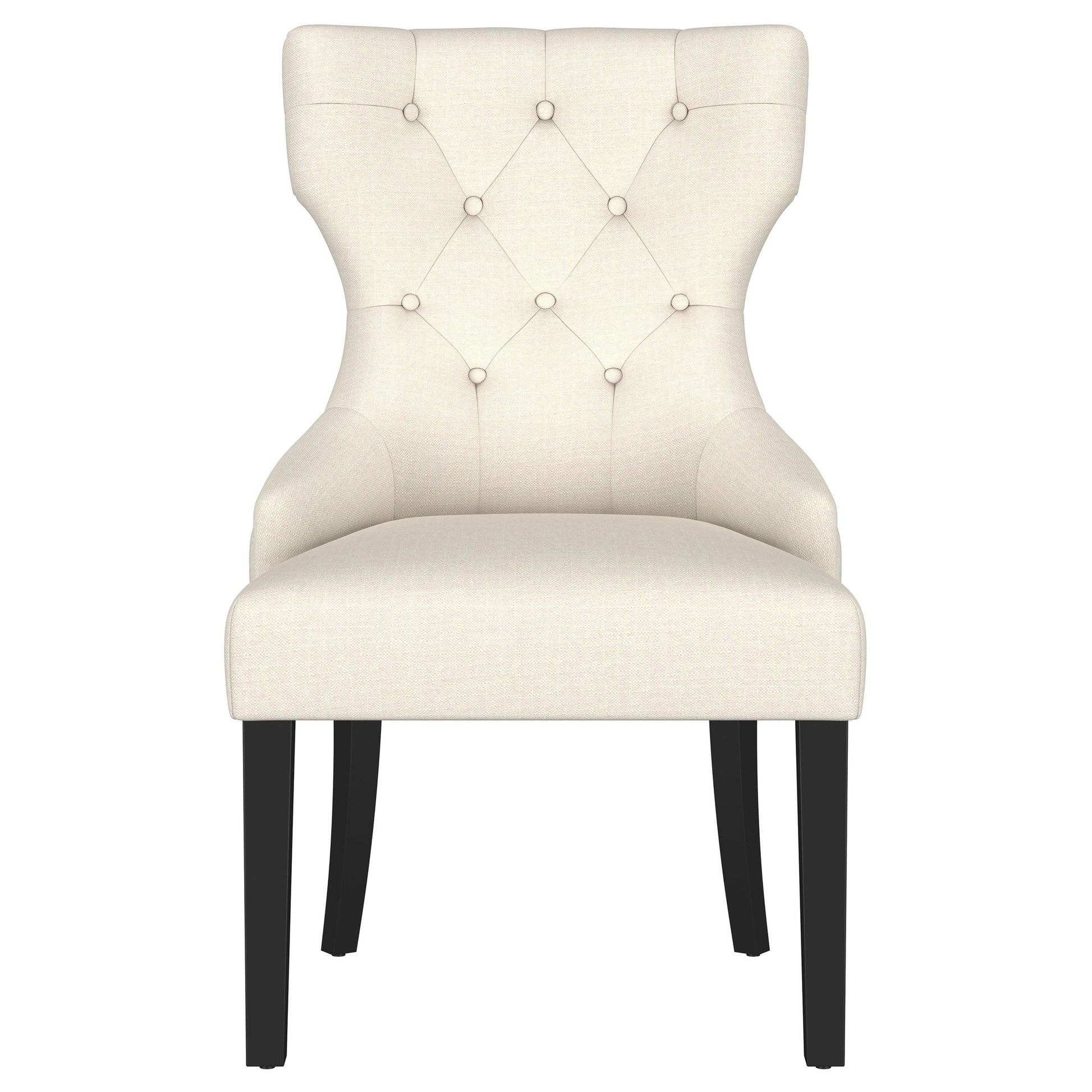 Create an exceptional, inviting dining room space with a modern button tufted dining chair. It pairs a classic wingback profile with a gentle curvature, offering impeccable comfort and chic style. Its plush back and seat feature foam cushioning with soft upholstery, delivering indulgent seating experiences to all who dine at your table. The back of the chair includes nailhead trim that adds a dimensional finishing touch. Black finish legs complete the look with austerity and excellent support.