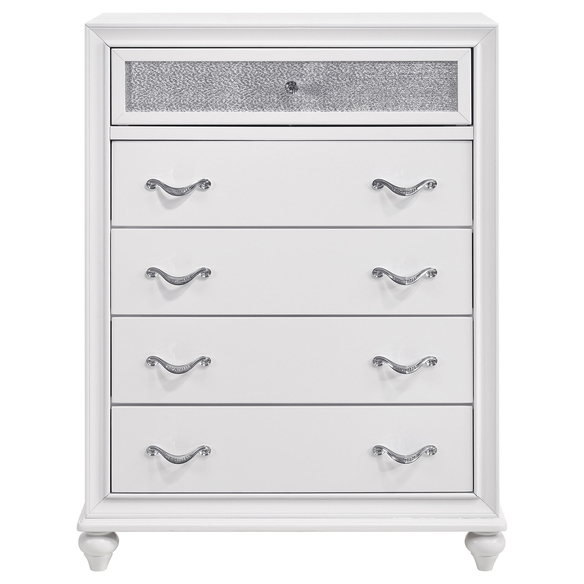 Transform your bedroom with the elegant design of this white set. The panel bed showcases metallic leatherette channel tufting framed by crisp molding and finished with turned feet for timeless charm. Coordinated storage brings added sparkle with glittery acrylic panels and faceted crystal hardware, blending modern radiance with classic details. Sculpted bun feet complete the look, while solid rubberwood, engineered wood, and okume veneer provide durability for lasting beauty and function.