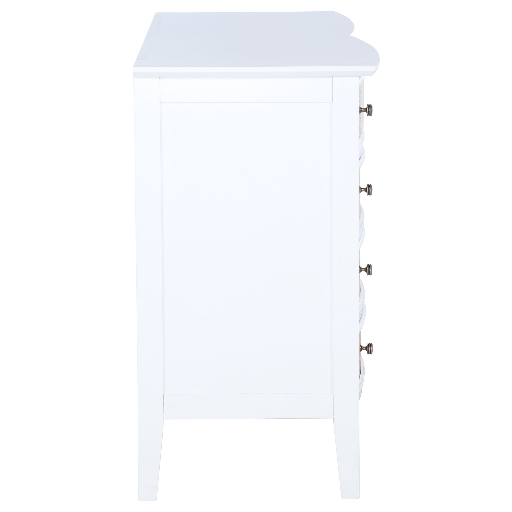 Play up approachable coastal character with a modern ten-drawer dresser in your bedroom. It shows off a gently double convex curved profile, complemented perfectly with a bright white finish that lends casual elegance. Each drawer front is adorned with natural rattan that offers the perfect dose of texture and character. Petite round knobs complete the look to perfection. Abundant drawers include four smaller felt-lined top drawers and six larger lower drawers, creating a perfect blend of storage for clothing, accessories, and personal effects.