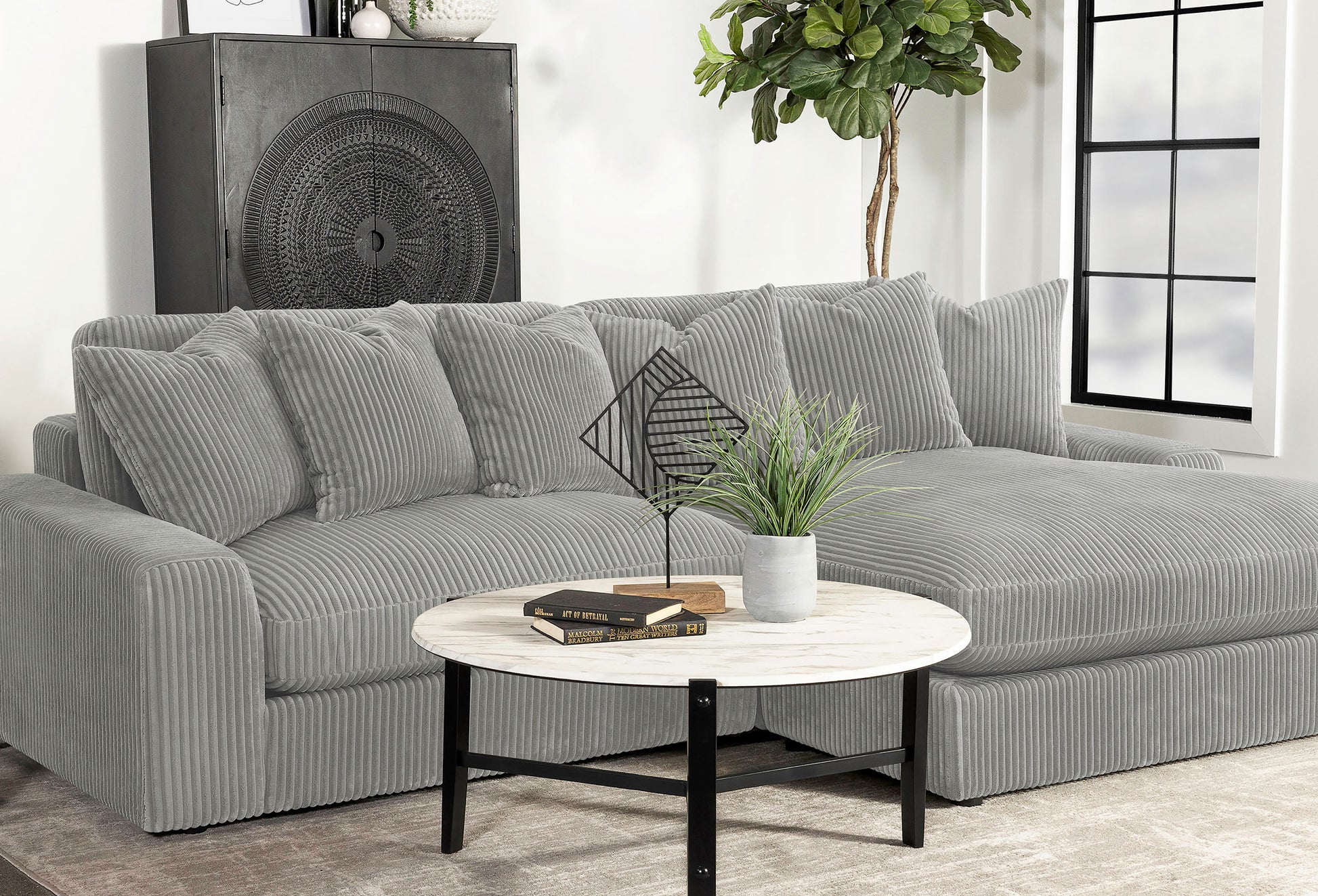 Add a retro-inspired look to your contemporary bedroom with this modern reversible sectional sofa, upholstered in a vintage-like wide corduroy performance fabric that offers a soft texture and an elegant fog tone. Each of the two pieces are appointed with reversible seats and back cushions that offer a versatile design, complete with wide track arms, black legs, and non-slip grips to hold everything in place.