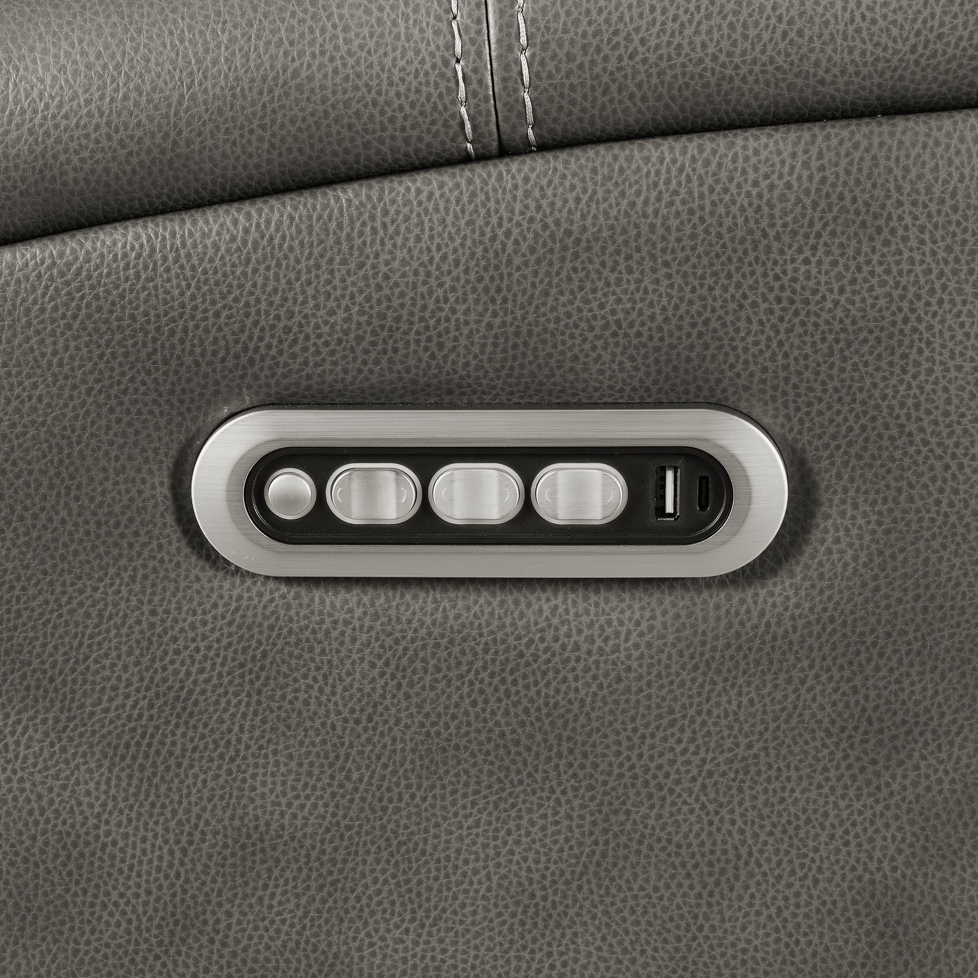 • Charcoal leatherette upholstery with contrast stitching offers soft texture and modern style