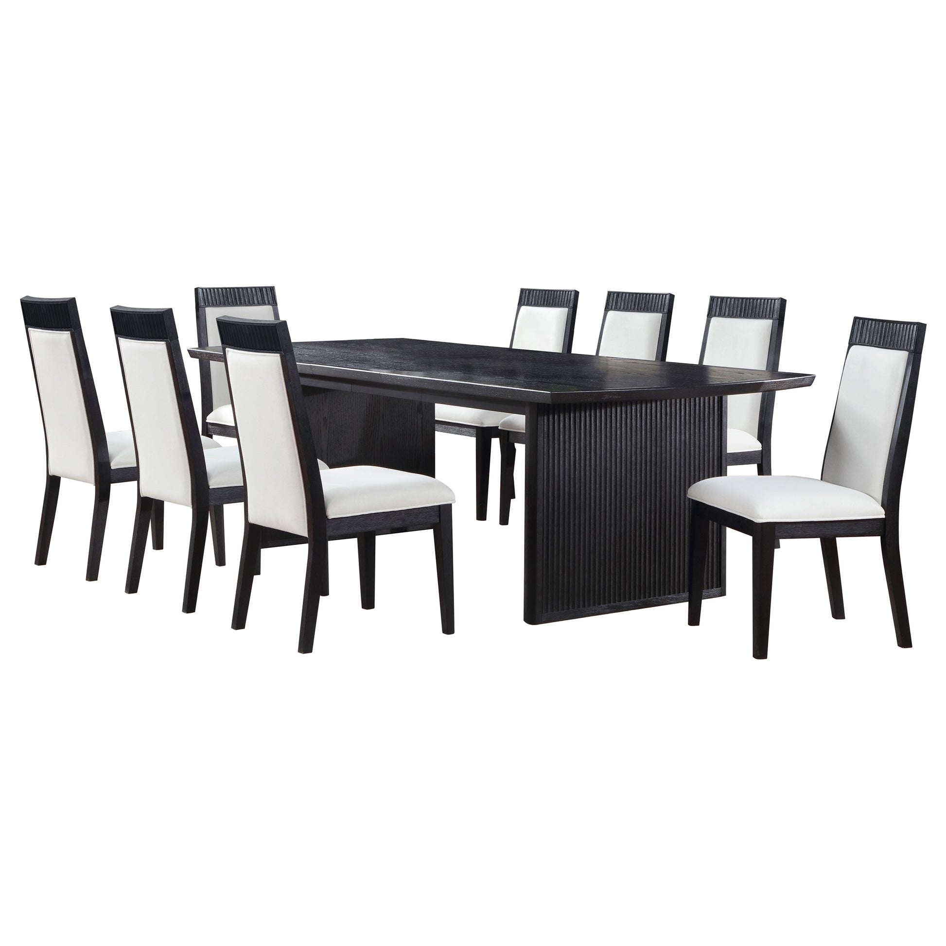 Inspired by trending interior design aesthetics increasingly mixing modern and traditional elements to invent its own style, this nine-piece wood dining set stands out to impress. Crisp, clean style and a contrasting color and finish palette begin the dramatic look of a set suitable for both modern and transitional settings important to your everyday living. Distressed black finish wood construction on all pieces gains attention to a minimalist table design with straight, flat leg sections under a sleek top with linear silhouetting and a dimensional top chamfer curving along its edges. Chairs offer a clean silhouette with black finish wood framing, tapered legs, and ornate notched tops with linear carvings thrown in for extra dimension. Soft ivory fabric upholstery is intriguingly placed on both sides of top cushions and over a padded seat.