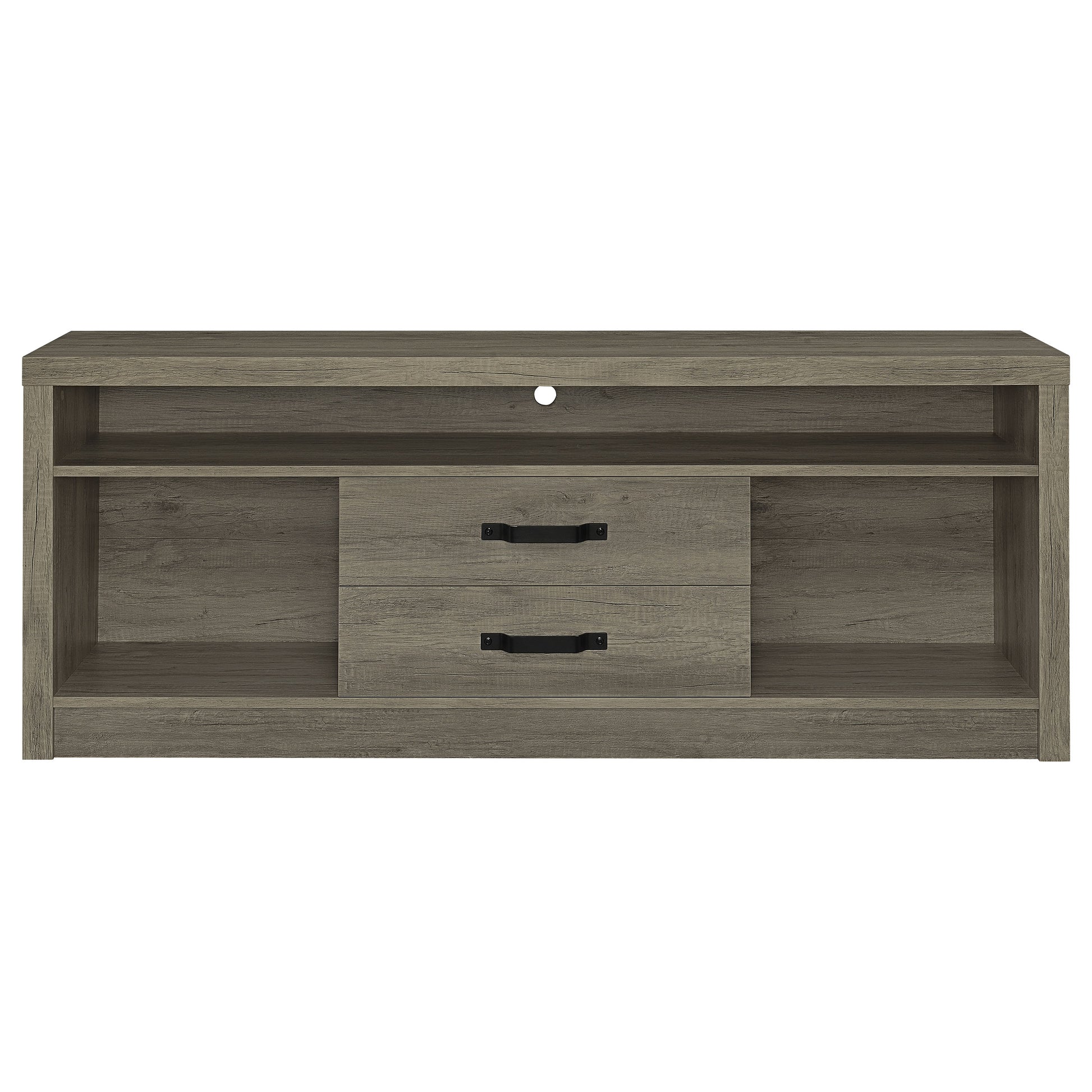 • TV stand offers two open shelves and two drawers with contrasting hardware for a pop of dimension