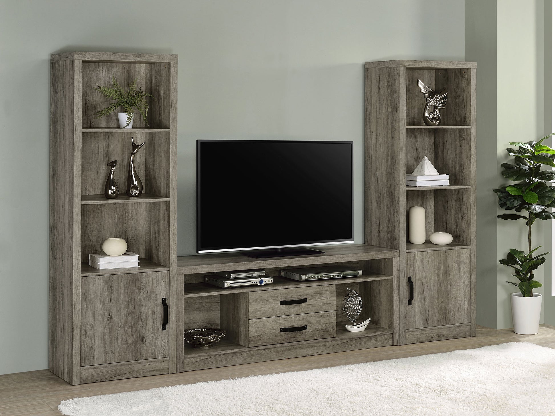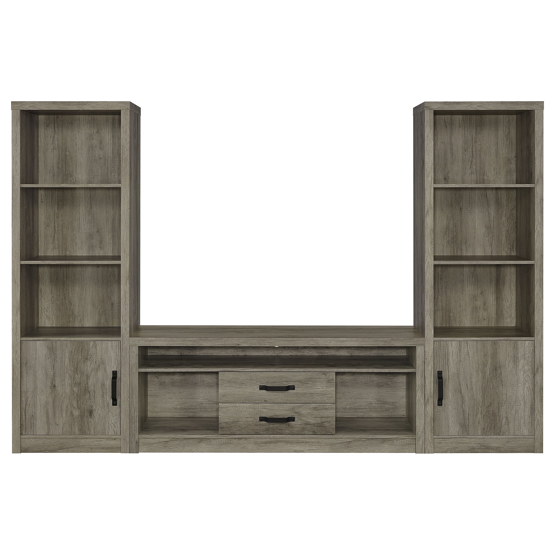 Design the entertainment mecca you've always imagined with this three-piece media center. Including a central TV stand and two media towers, the set delivers simplicity of silhouette with plenty of storage options to accommodate your needs. Gray driftwood finish laminate surfaces are durable and resistant to scratches and denting, offering impressive durability. The TV stand offers two open shelves and two drawers, each with contrasting hardware that adds a pop of dimension. The media tower each add three upper shelves and a lower cabinet, creating the perfect blend of storage and display spaces to bring personality to your welcoming living room.