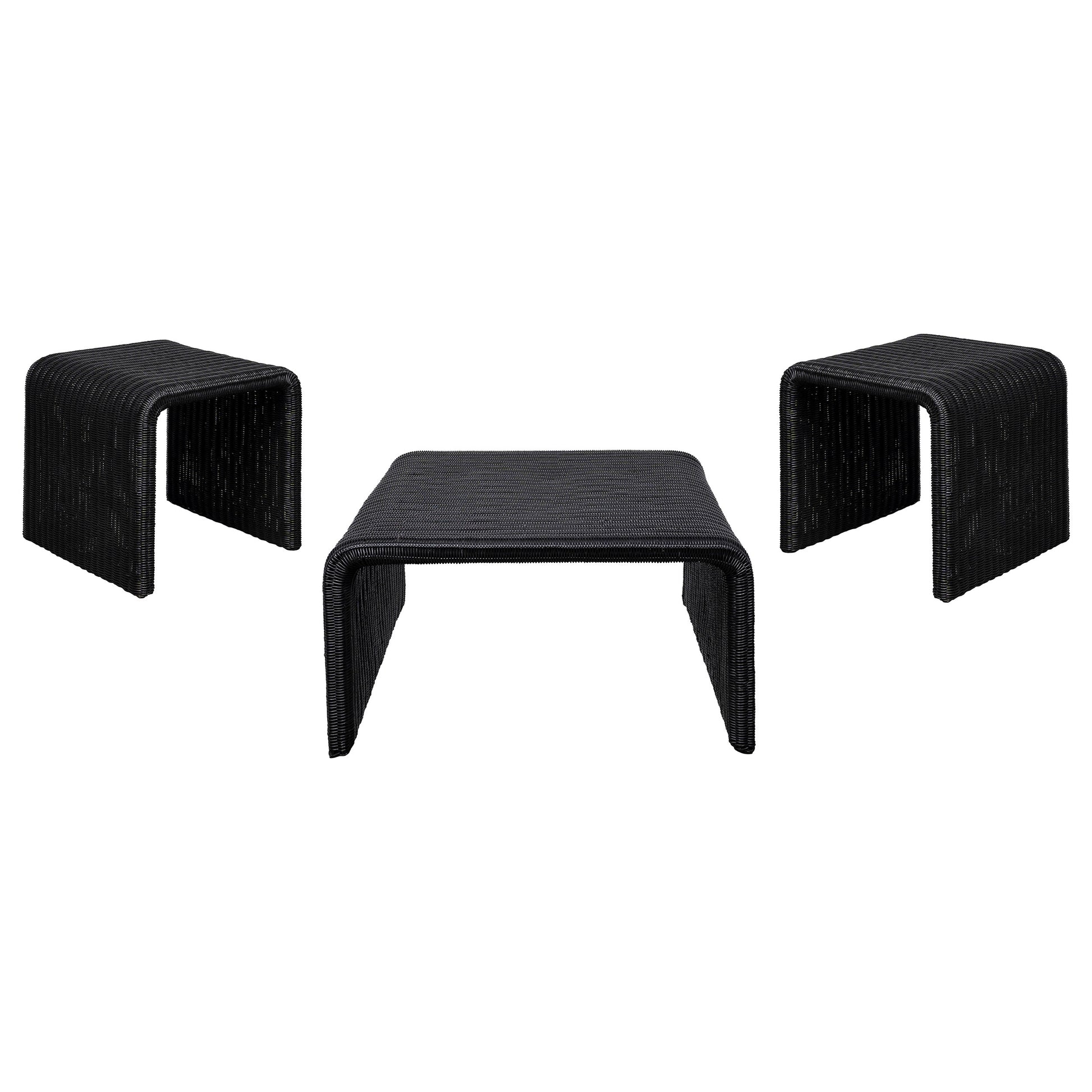 A retro-inspired coffee table set brings vintage charm with modern versatility. The minimalist inverted U-shape design nods to 1970s furniture style, offering a sleek yet functional addition to casual spaces. Crafted from black metal with a woven surface, this occasional table set blends industrial durability with unexpected glam. Whether placed in a living room, bedroom, or kitchen, these tables provide a sturdy build and timeless appeal, making them a standout choice for retro and modern interiors alike.