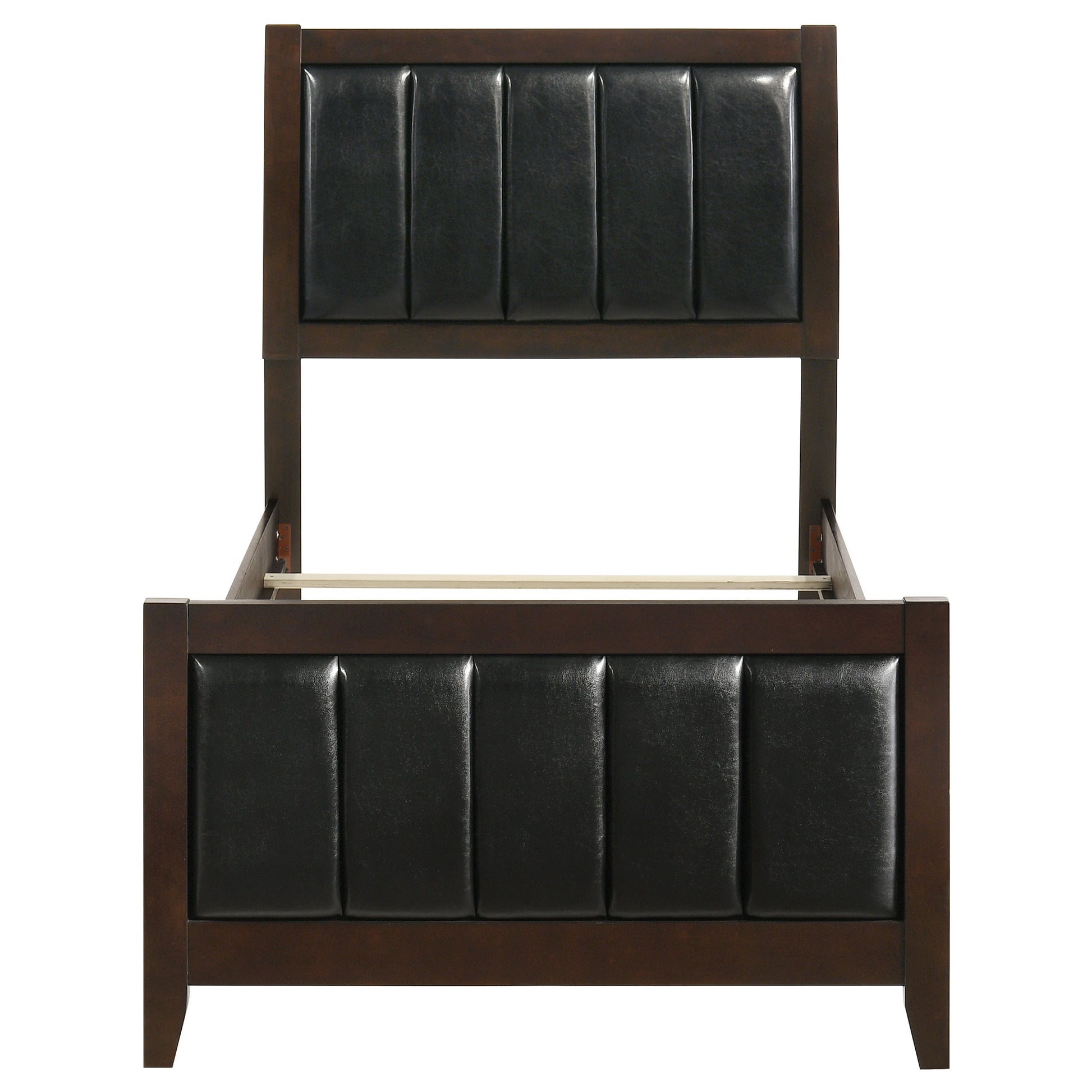 A timeless centerpiece, this panel bed blends mid-century inspiration with modern sophistication. Crafted with clean lines and a bold silhouette, it showcases a rich cappuccino wood finish for warmth and depth. The headboard and footboard feature black padded leatherette panels with vertical channel detailing, offering both comfort and refined texture. Constructed from rubberwood, veneer, and engineered wood, this bed delivers enduring strength and style that enhances any bedroom retreat.