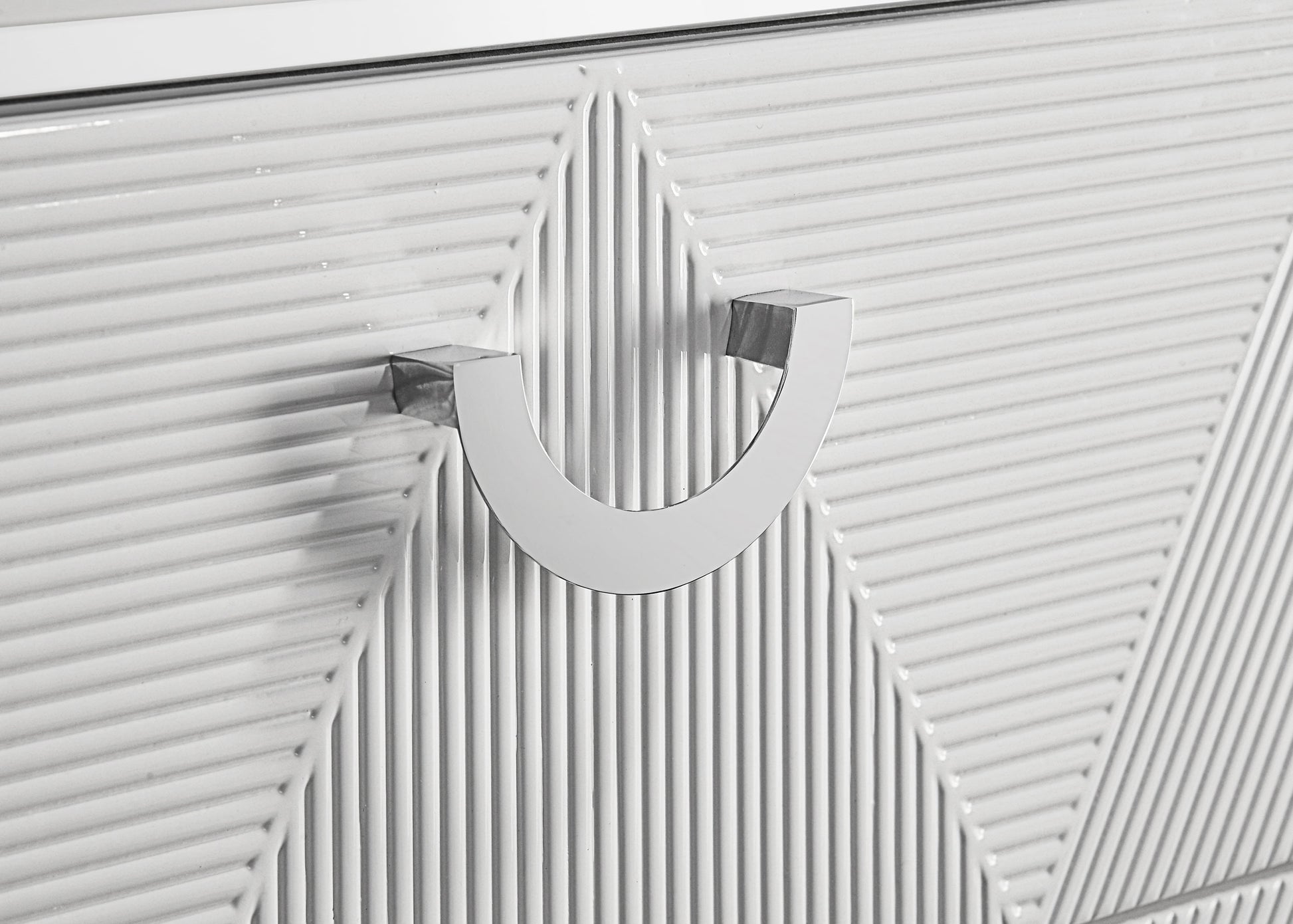 • Five-drawer chest in white high gloss finish with sculptural ribbed geometric drawer fronts