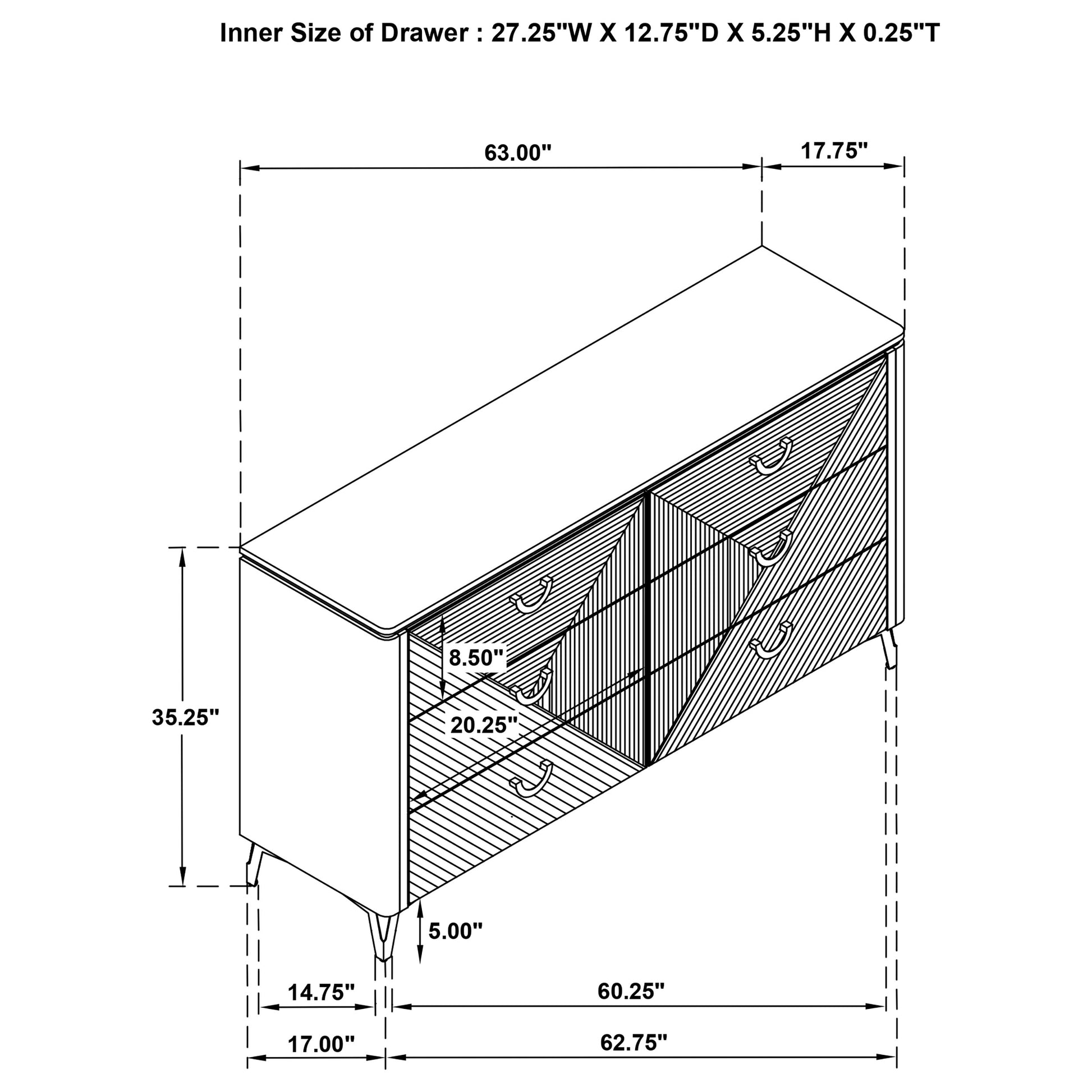 Crisp white high gloss and sculptural textures define this modern bedroom set, blending sleek surfaces with dimensional details. Geometric drawer fronts feature ribbed V-patterns and polished chrome pulls, while all drawers glide smoothly on 45mm metal extension hardware. The headboard stands out with chevron-tufted white faux leather framed by soft white LED trim. Completing the ensemble, a coordinating LED dresser mirror adds ambient glow and polished symmetry to the space. Elevated on chrome legs, this set is a showcase of contemporary form and function.