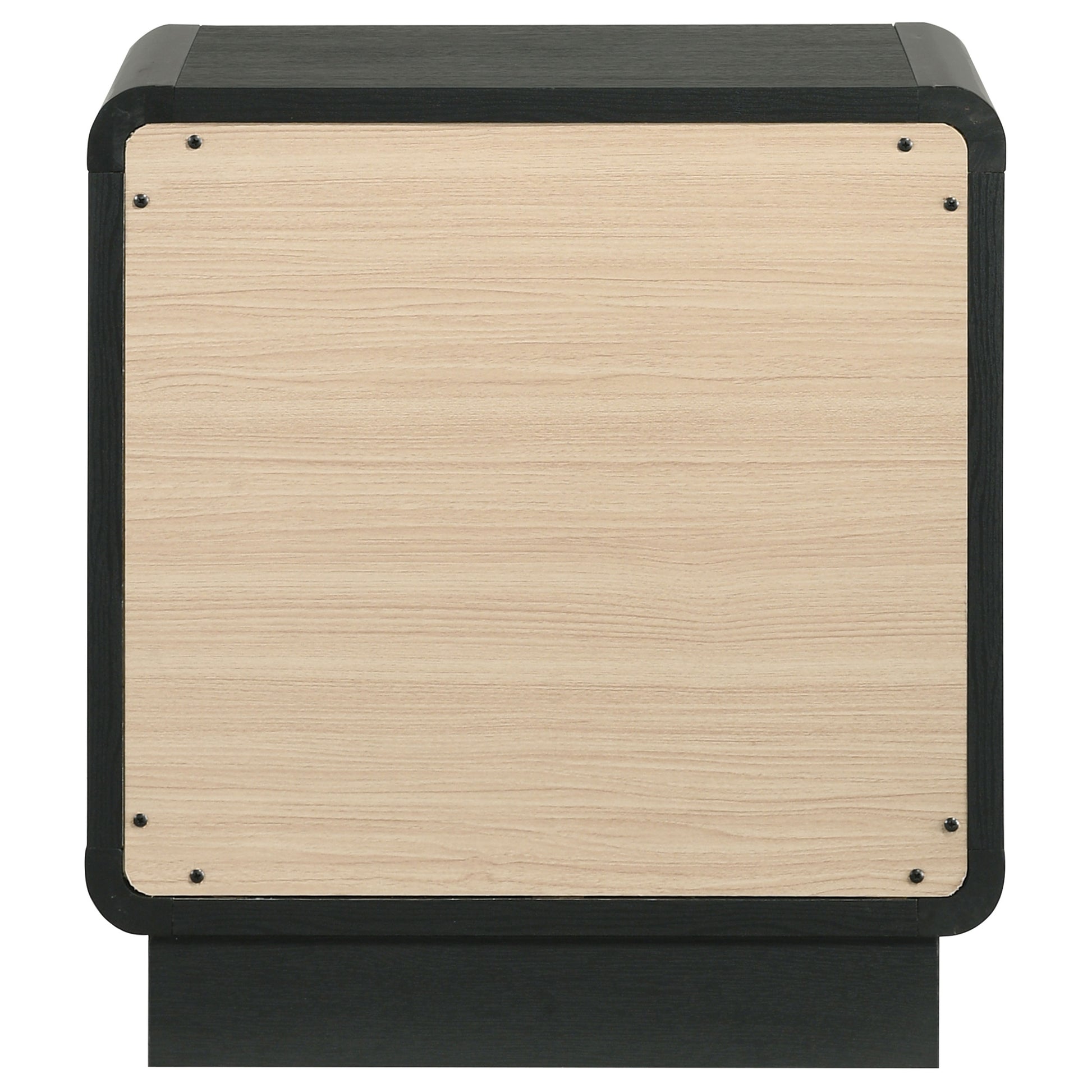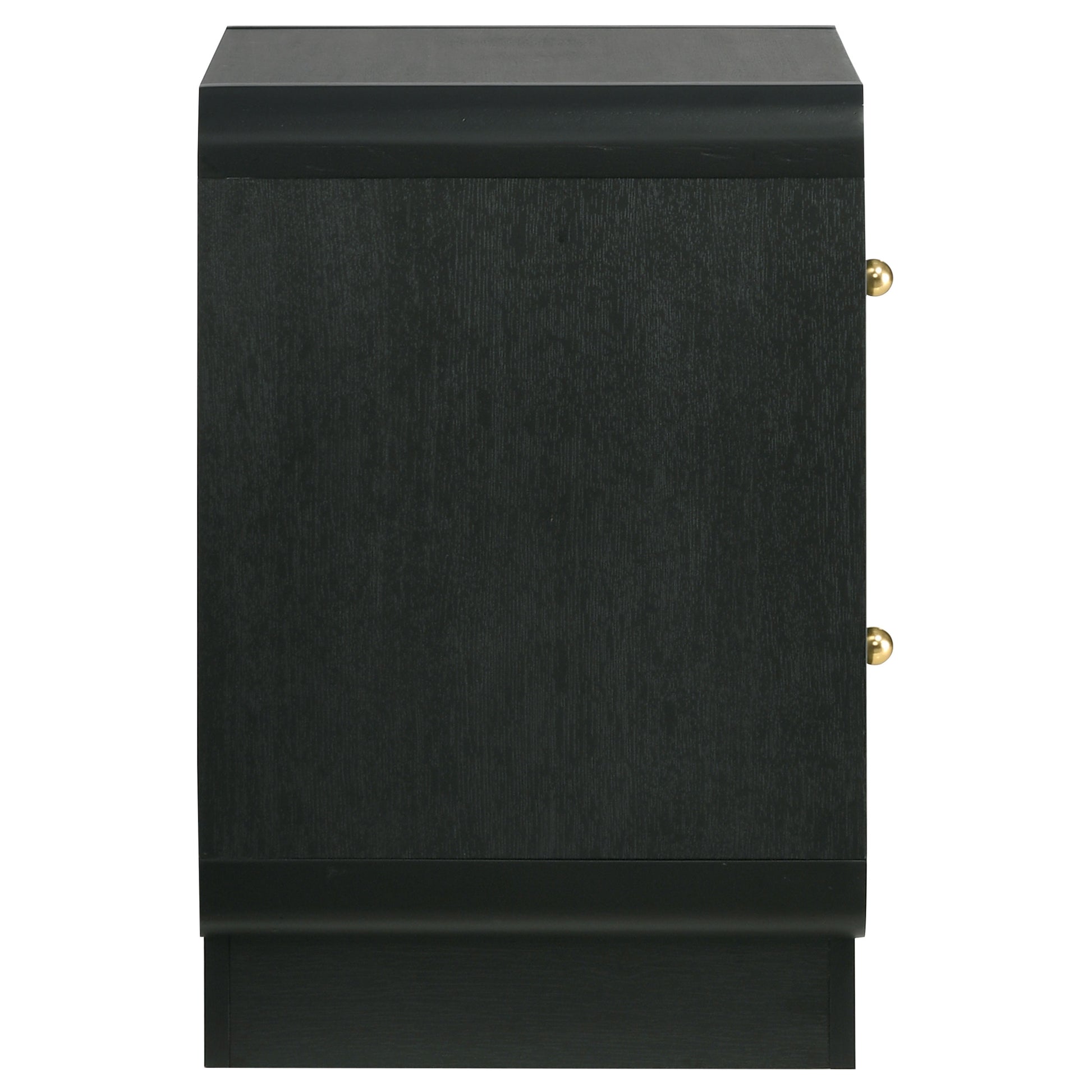 Put finishing touches on a sophisticated bedroom ensemble with this modern two-drawer nightstand. Offering roomy storage for overnight essentials, it features a rich black finish over melamine surfaces that are designed for longevity. The nightstand features a rounded corner case, creating a softened effect in a luxurious space. Drawer fronts are complemented with brass-finished ball knobs, adding the perfect hint of warmth and sophistication. A recessed base completes the look, while metal drawer glides provide for smooth, seamless operation.