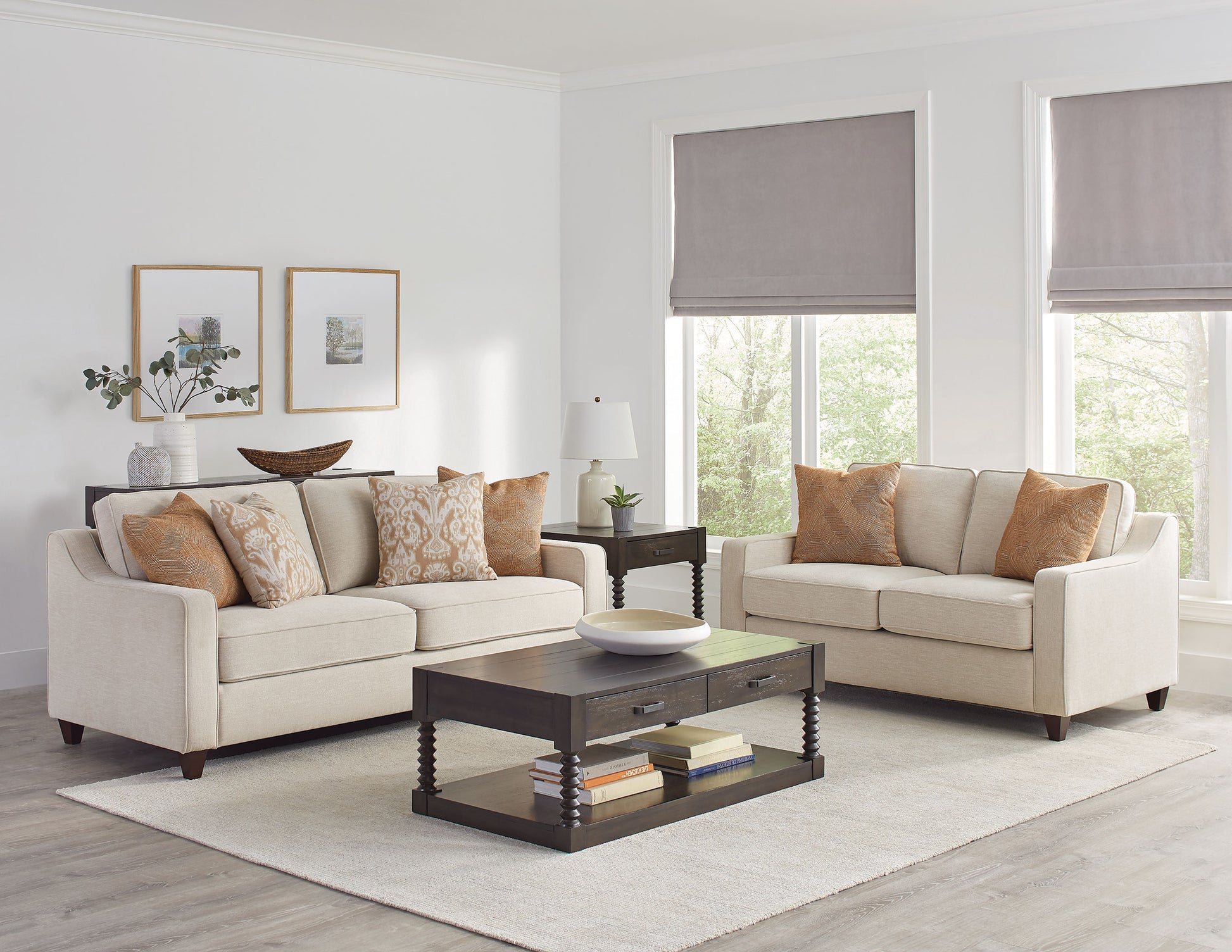 Brighten your living space with this upholstered sofa wrapped in soft beige chenille. Designed for comfort and elegance, it features gently sloped track arms and tall tapered wooden legs that create a refined transitional silhouette. The boxed seat and back cushions include classic welt trim for tailored appeal, while coordinating accent pillows in copper and coral tones bring subtle contrast. Built with a durable wooden frame and foam cushioning, this sofa blends timeless design with everyday comfort.