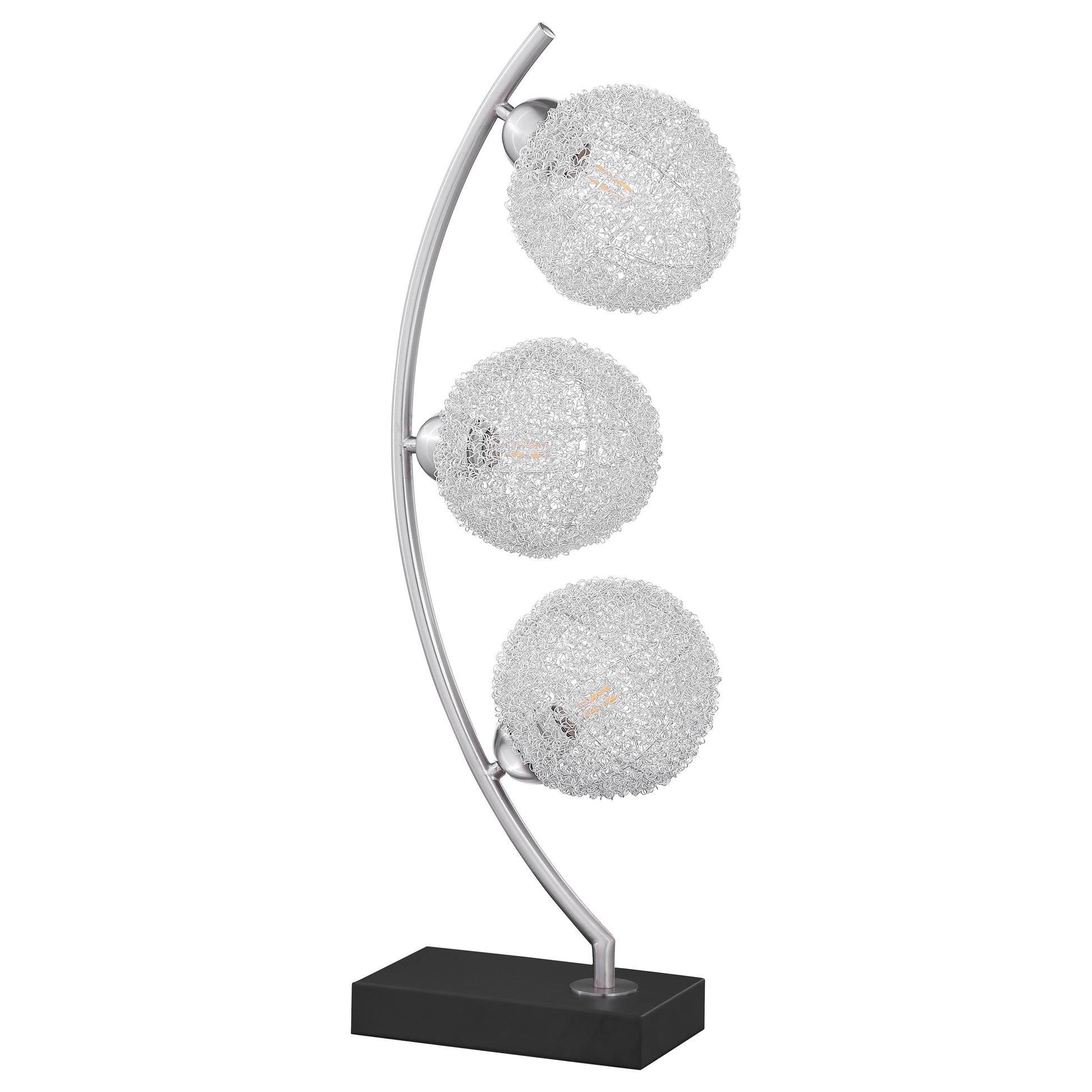 Graceful silhouetting pairs with a trio of elegant wire frame orb shades in a modern table lamp. Designed to make an impact on a console or side table, it features a fresh, modern look complete with a vertical arc frame in a chrome finish. The arc hosts three orb shades made from metal mesh, creating a striking effect of light and shadow. The light features three lights, each with an energy efficient 4-watt bulb that delivers bright illumination at a fraction of the cost. Finally, the lamp rests on a black finish rectangular base and offers a touch switch for truly seamless operation.