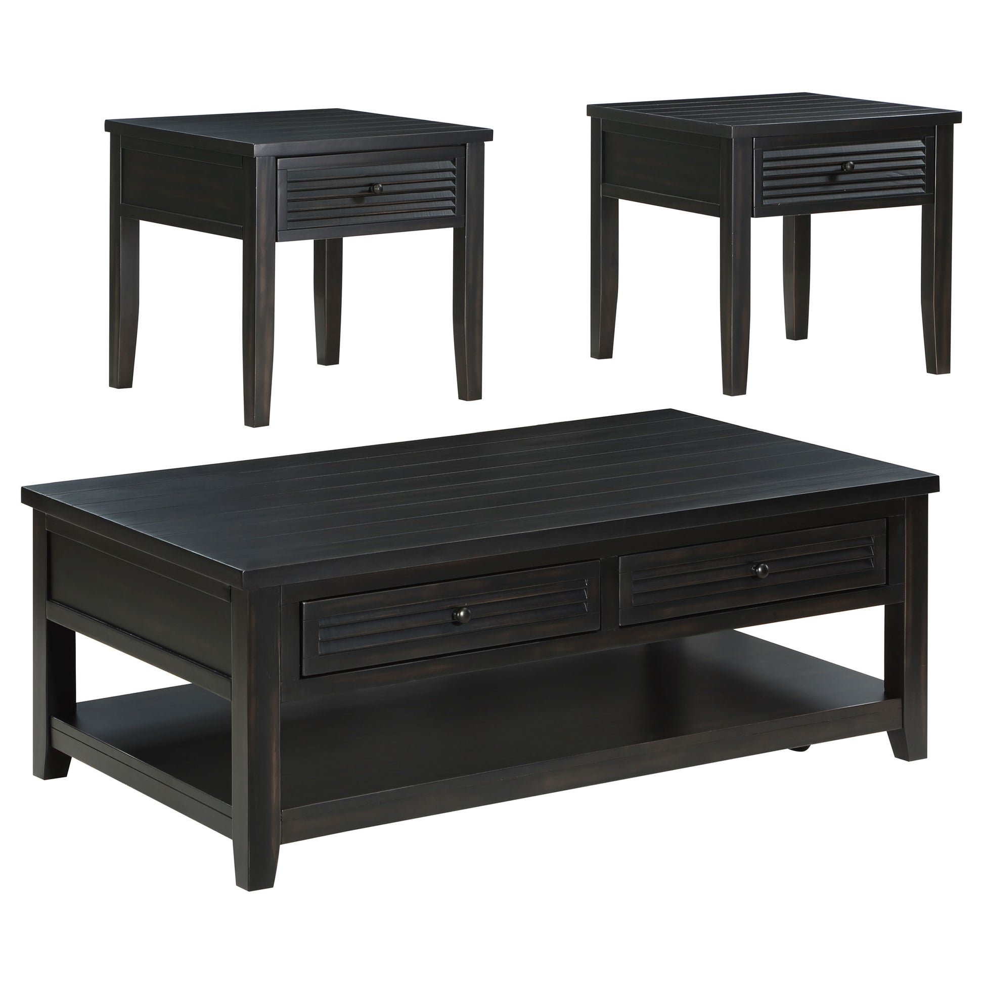 Elevate your living room with this stylish coffee table set, blending rustic charm with functional design. Crafted with solid wood legs and an engineered wood frame, each piece features a distressed java finish over pine veneer for a warm, timeless appeal. The planked wood tops and louvered drawer fronts add texture and character, while the drawers provide practical storage solutions. Perfect for creating a cohesive and inviting space, this occasional table set offers both style and convenience.