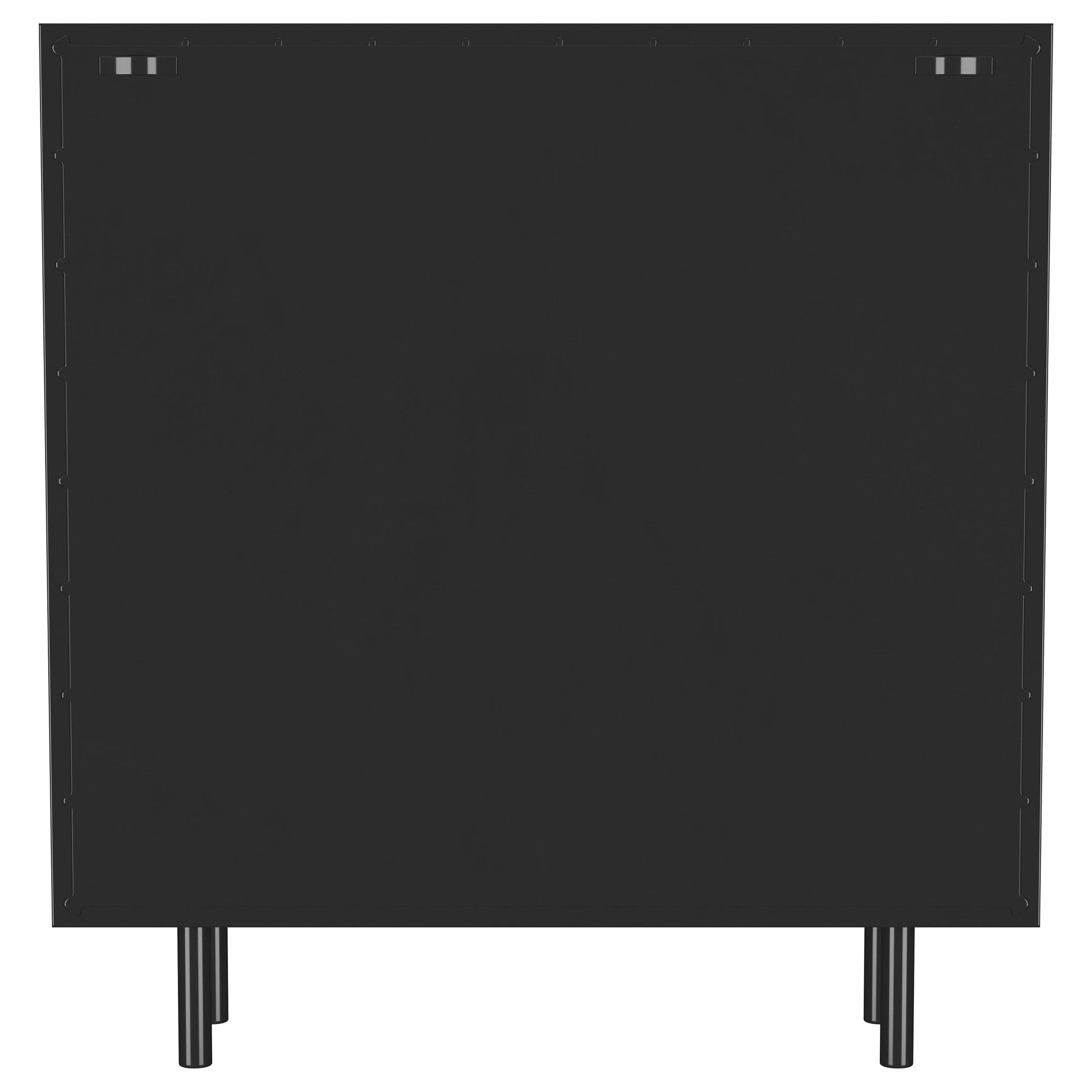 Create a stylish, engaging spot for easy storage with a modern industrial accent cabinet. Blending beautifully in casual, urban, and farmhouse settings, it features metal construction with a rich black finish that offers a neutral complement to your space. The cabinet features two clear glass doors with vertical ribbing that creates a wavy, watery effect and provides a touch of camouflage for items placed within. Metal overlays decorate the doors further, adding a geometric element sure to catch your eye. The cabinet opens to reveal two fixed shelves, great for everything from boardgames in the living room to serve ware in your dining room.