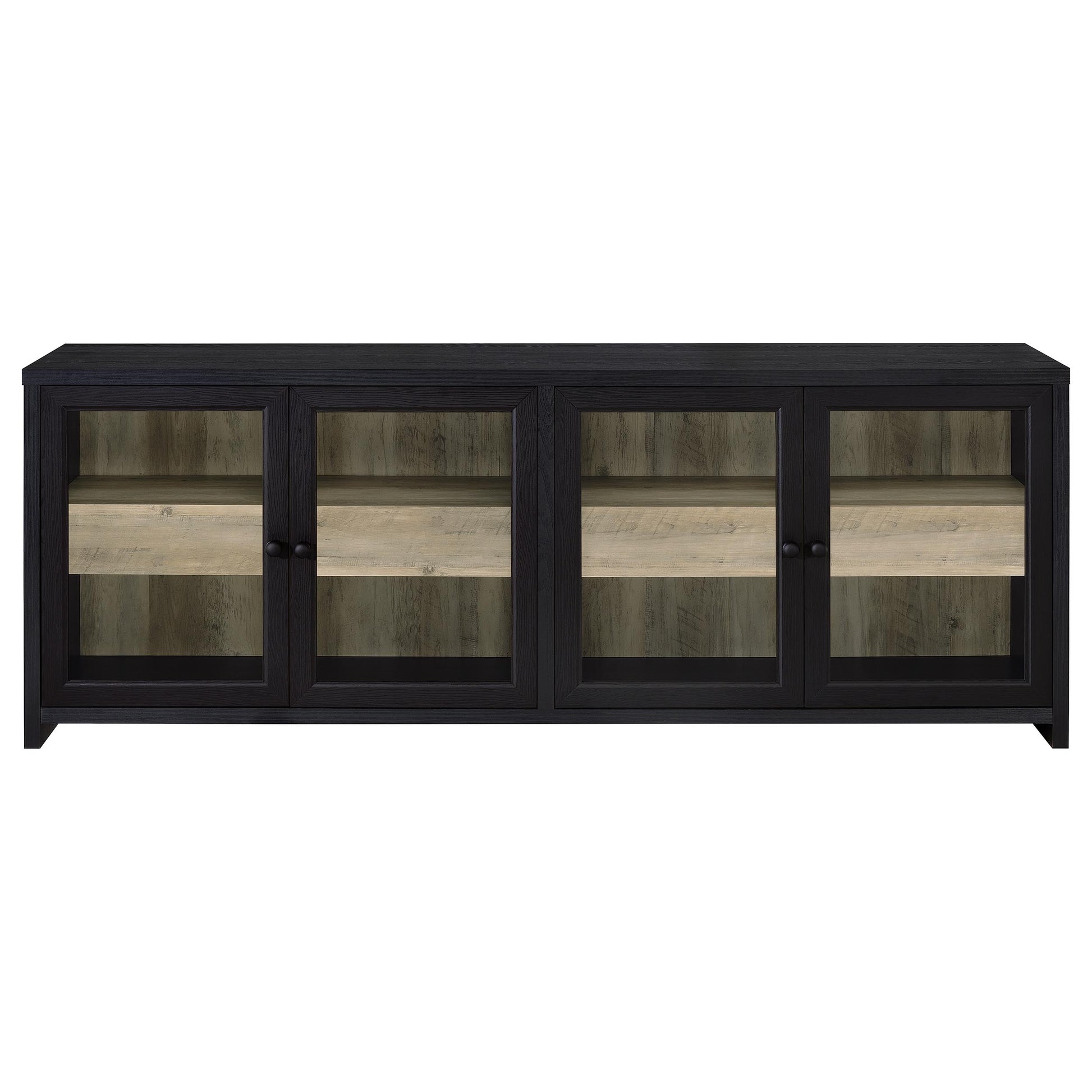 • Four glass-front cabinet doors on the TV stand conceal spacious open shelving for electronics