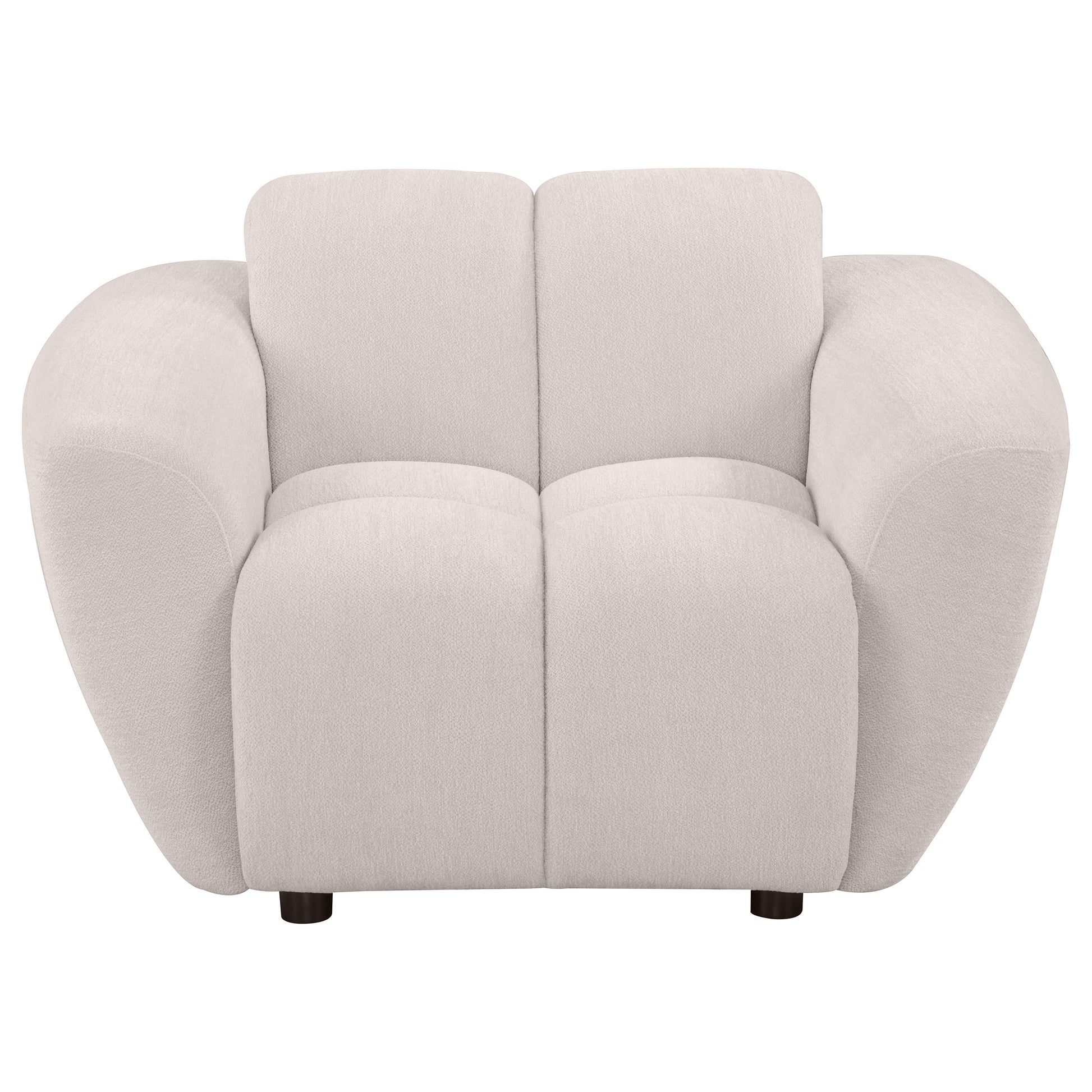 This sculptural accent chair from the Destino collection makes a bold statement with its wide splayed arms and chunky channel-tufted upholstery. Covered in soft greige chenille, it features a plush attached waterfall seat built with pocket coil construction for support that lasts. The grid-like contouring adds dimensional appeal, while its low, padded profile invites deep lounging. A modern silhouette grounded in comfort, it's the perfect standalone piece or complement to the full set.