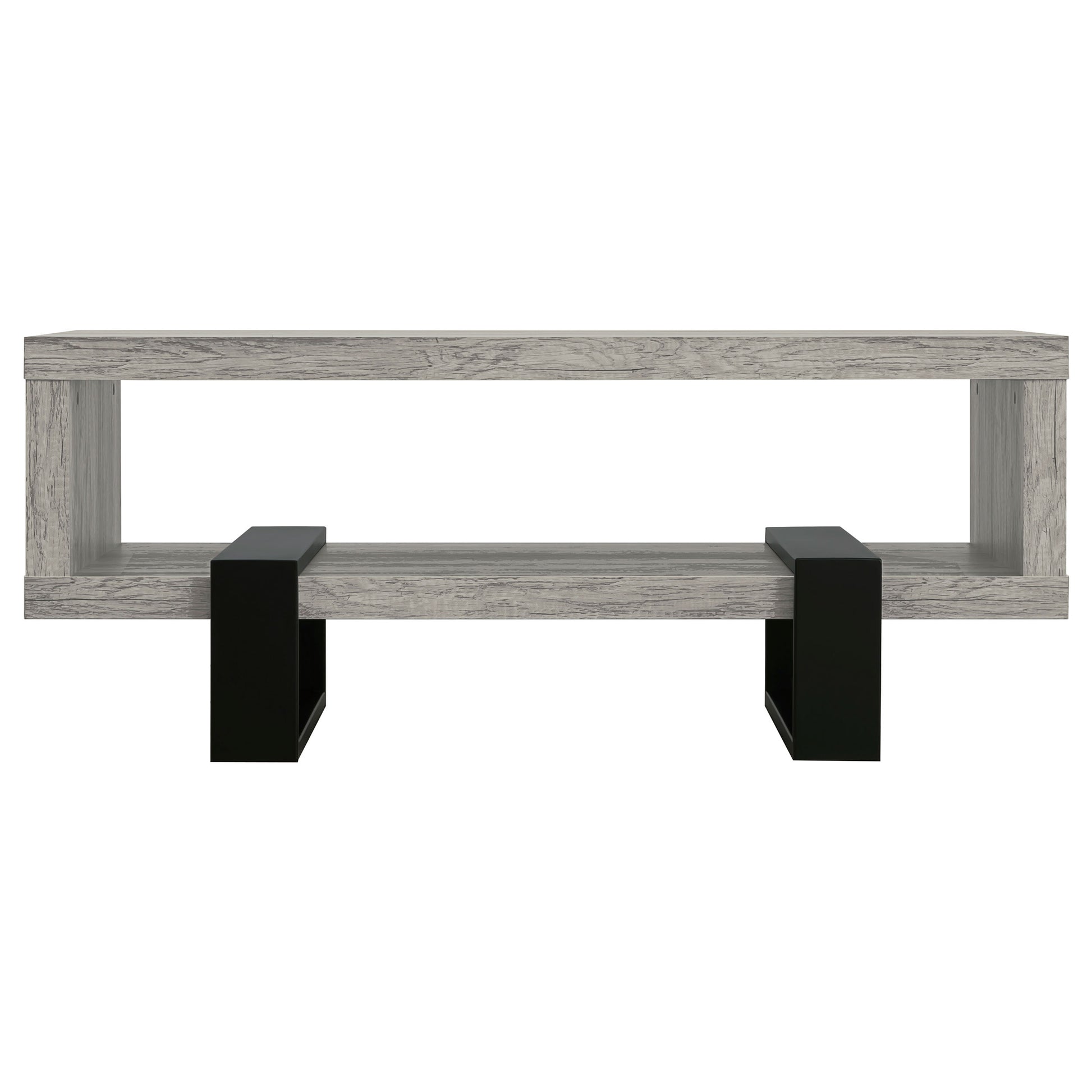 Experience a modern aesthetic with this rectangular coffee table that combines style and functionality. The grey driftwood finish highlights realistic wood grain, creating a rustic yet contemporary look. Crafted from durable engineered wood with a scratch-resistant laminate veneer, it offers long-lasting appeal. The bold black geometric legs provide sturdy support while adding industrial-inspired charm. Its versatile design and lower shelf make it a practical and stylish addition to any living room.