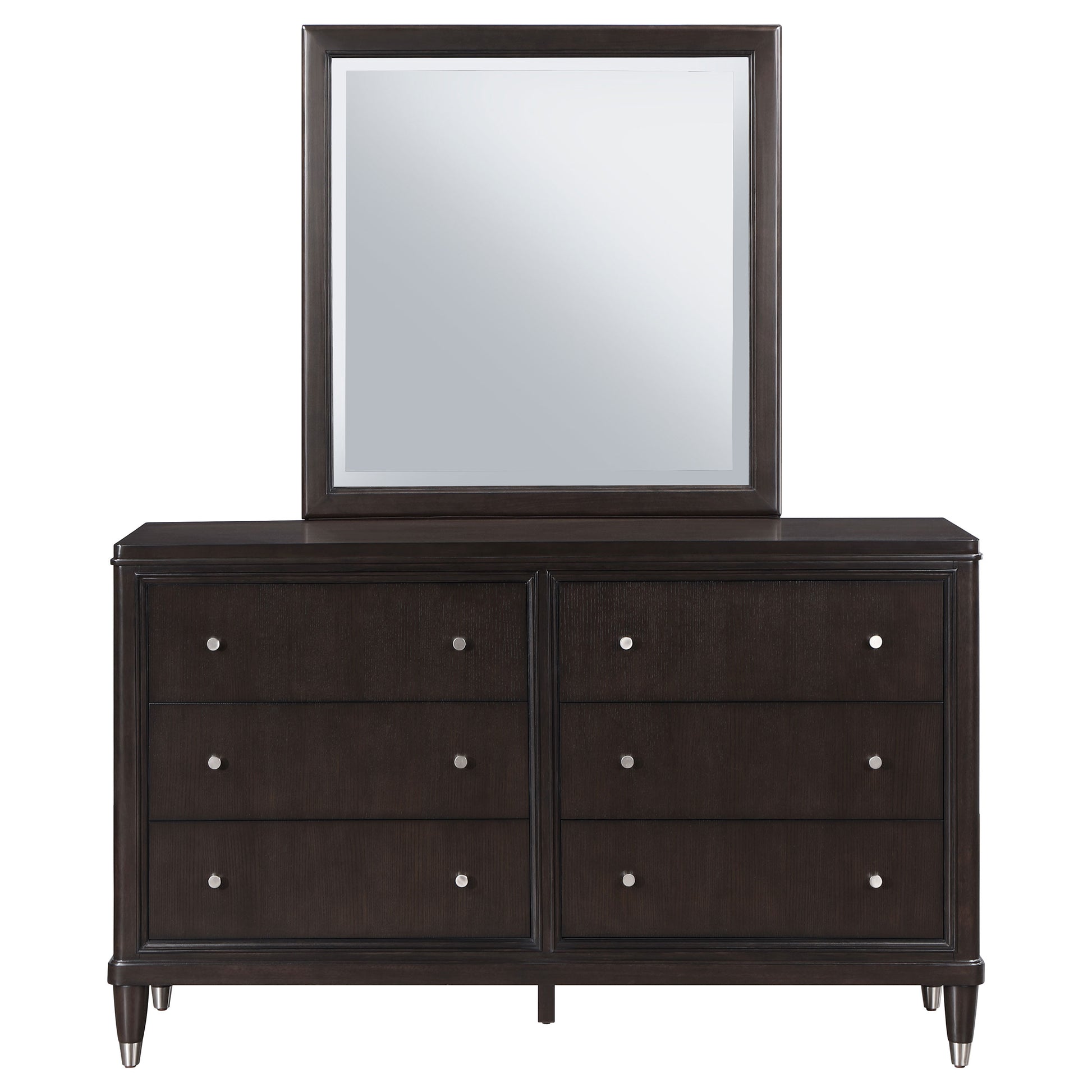 Bring stylish flair and plentiful storage to your bedroom with a modern six-drawer dresser and mirror. It showcases a dark brown wood finish, paired with silver-toned round knobs and ferrules on its legs that add gleaming contrast and depth. Six drawers provide ample storage and organization for clothing and accessories, with a red-brown velvet lined jewelry tray included that's ideal for protecting pieces you wear regularly. The mirror on top of the dresser creates a vanity like space, and is framed for a finished look and feel. This stylish dresser is the perfect addition to your existing bedroom ensemble.