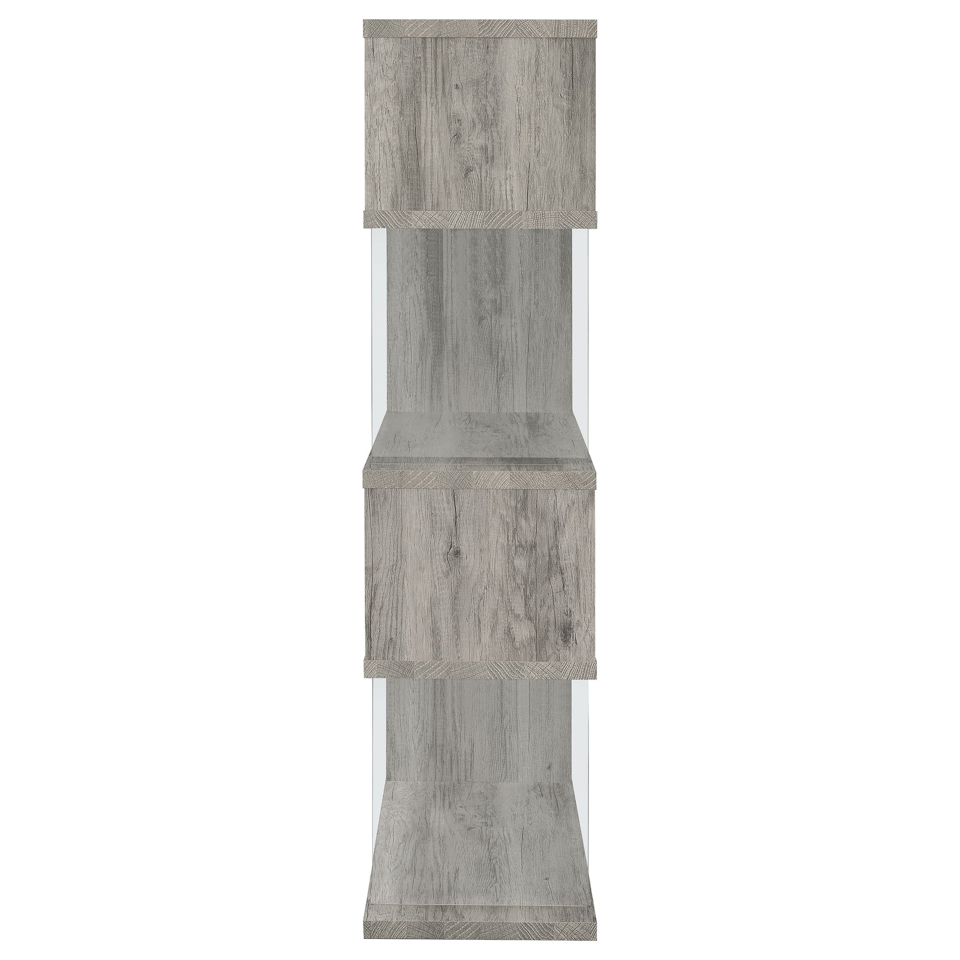 The asymmetrical zig-zag design of this contemporary bookcase creates a focal point in any room. Five open shelves in a light grey driftwood finish stack elegantly, supported by clear glass side panels that lend a modern flair to this furniture piece. Perfect for home offices, living rooms and much more, showcase anything from a book collection, decor, and other favorite items for all to see. With a flush base, this open bookcase unit rests sturdily and securely on the floor. Clean lines and a wonderful jagged design offer up style, functionality, and a stunning display.