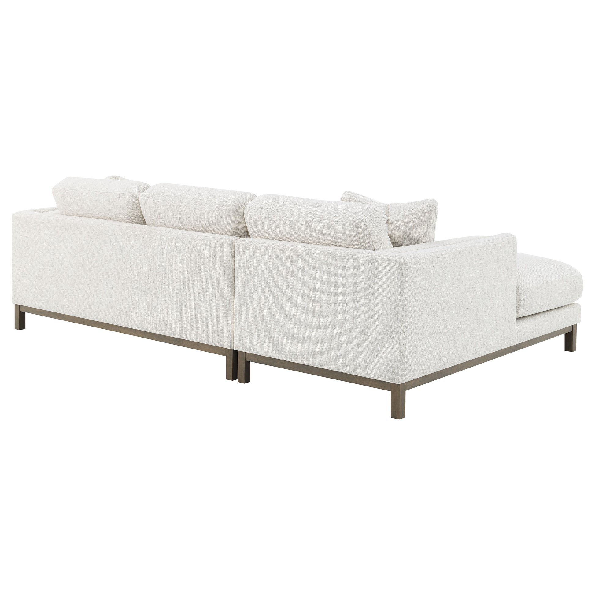 Indulge in the inviting comfort of this modern sectional sofa, thoughtfully designed with a left side chaise to accommodate your personal lounging preferences. Upholstered in a soft, textured fabric, complemented with a solid wood pedestal base in ash brown, creating the perfect stylish seating foundation. Fulling encased engineered wood frame, sinuous spring seating and foam combined with premium blend fill create a plush, resilient feel. Complete with reversible back cushions, reversible single cushions, removable chaise cushion and coordinating accent pillows, this sectional becomes the stylish focal point of a welcoming, contemporary living room.