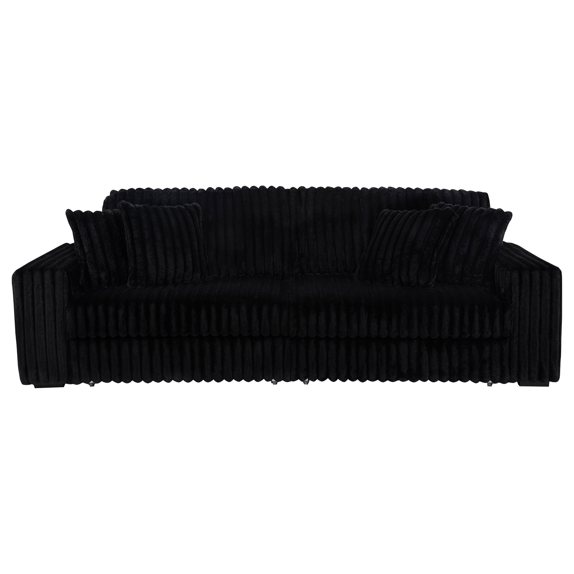 Striking and indulgently soft, this modern sofa set blends bold styling with innovative comfort. Deep vertical channel tufting enhances the rich corduroy upholstery, while dual power chaise functionality allows either side to extend independently, transforming the sofa into a full lounging surface. Wide arms, plush foam cushioning, and an integrated control panel with USB-A and USB-C charging bring next-level convenience. Designed for luxurious, tech-savvy relaxation.