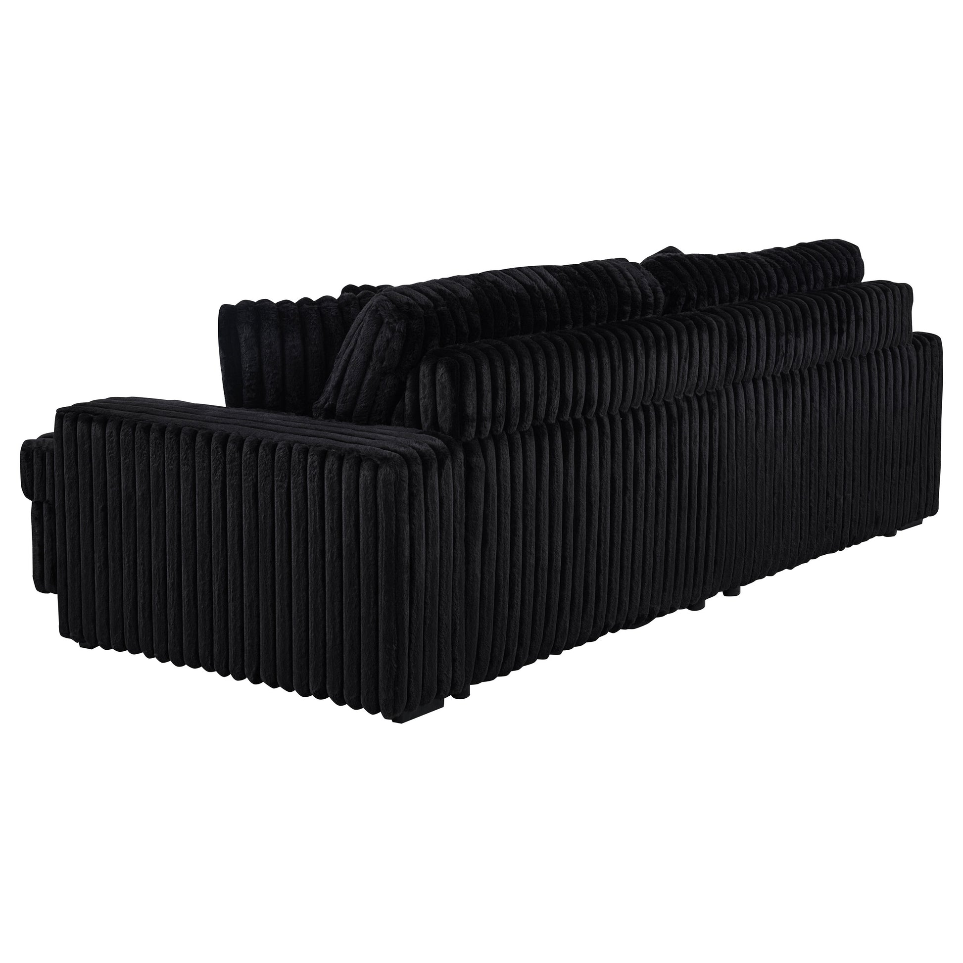 • Contemporary sofa set in black corduroy features deep channel tufting and dual power chaise design