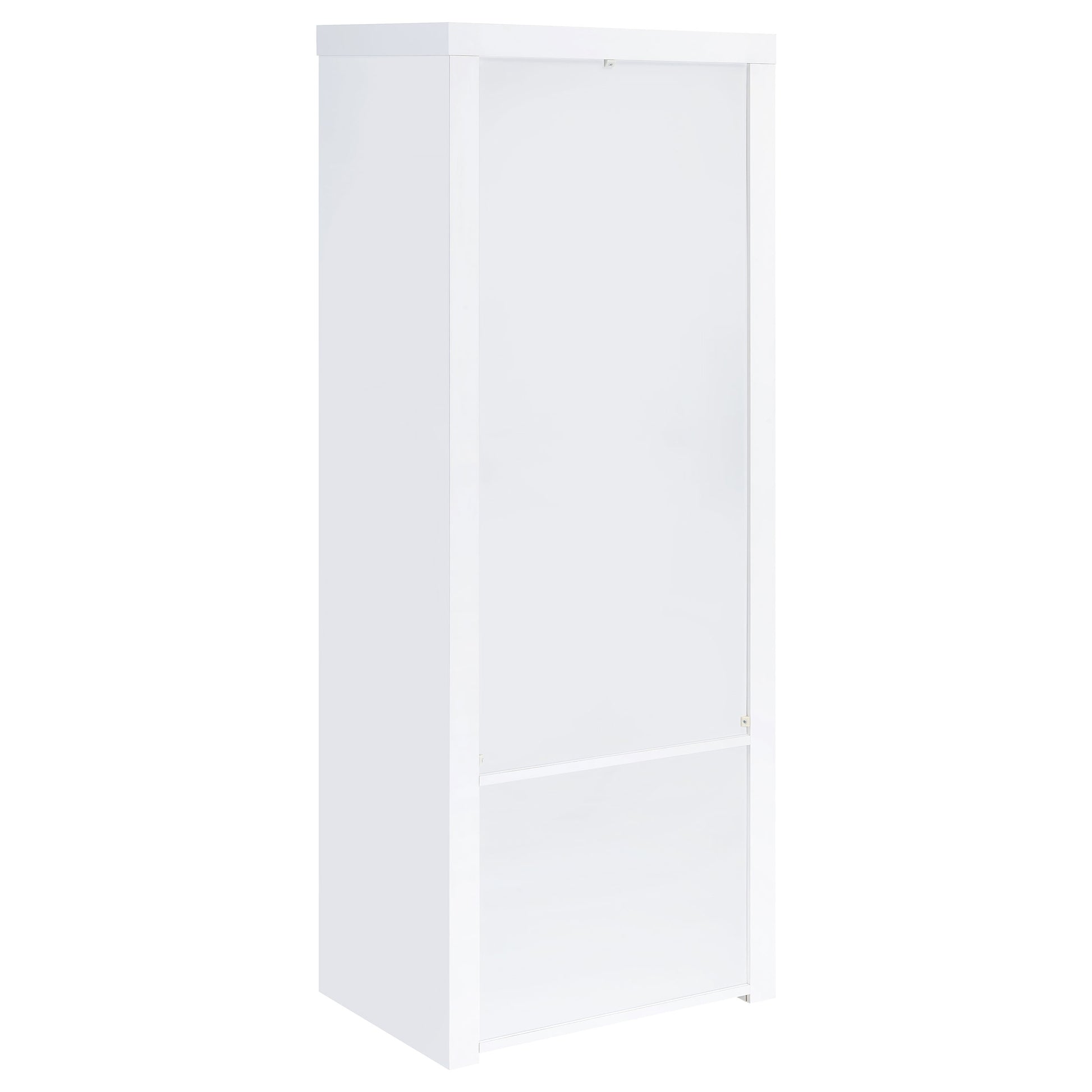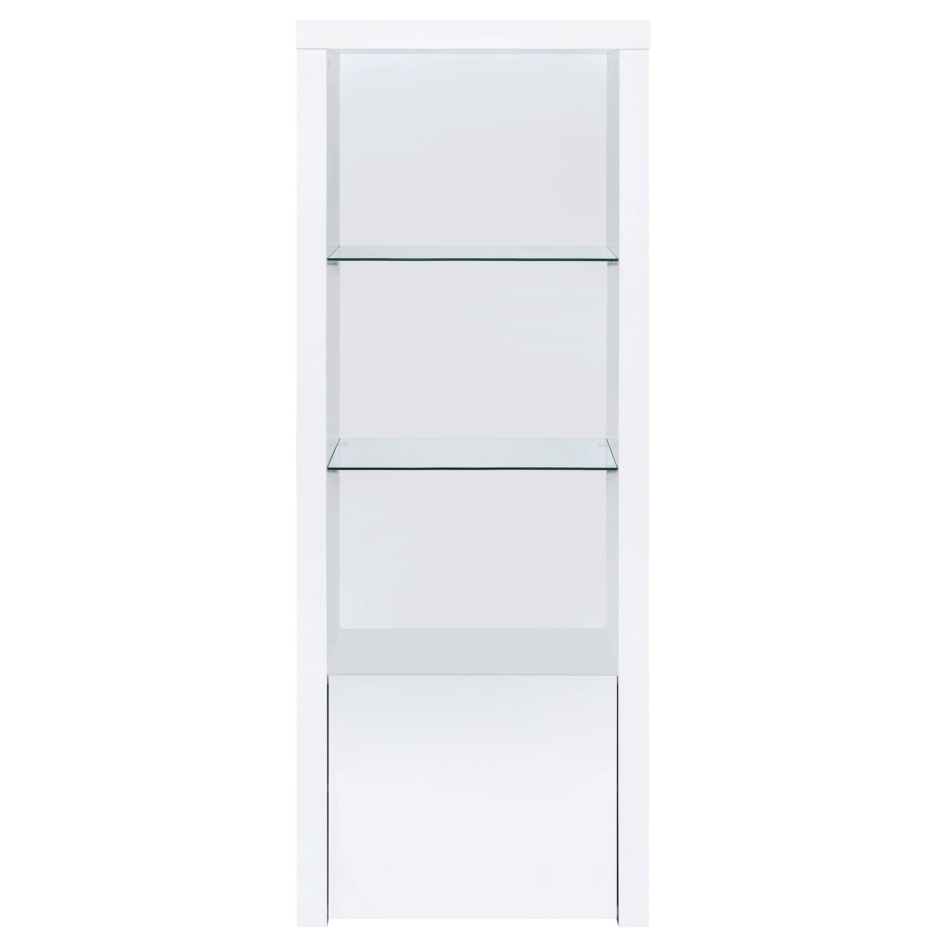 Extend a media console or add easy display space in a den or bedroom with this contemporary tower. Designed to accompany the matching media console, the tower adds a lower cabinet with shelving inside, and a pair of glass display shelves. It’s the perfect solution when both hidden and accessible storage are desired. A crisp white finish adds to the modern look and complements virtually any space. Melamine paper surfaces are designed for durability, perfect for everything from games and media to charming decor.