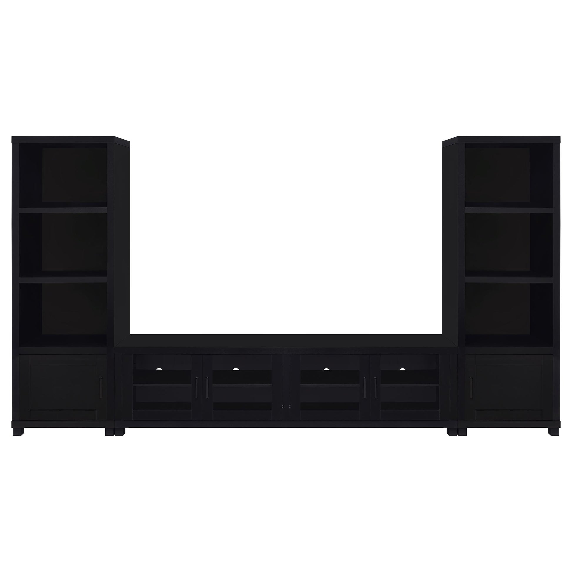 Transform your living room into the ultimate entertainment hub with this sophisticated three-piece entertainment center. Anchored by a commanding 79-inch TV stand, this set is designed to accommodate up to an 85-inch television, bringing a cinematic experience right into your home. The TV stand features four doors that open to adjustable shelves, perfect for organizing your media devices, gaming consoles, and more. Flanking the TV stand, two sleek media towers offer additional storage and display options, with open shelving for your favorite books and decor, and a concealed cabinet for hidden storage. Finished in a striking black hue, this entertainment center blends modern elegance with functional design, creating a seamless and stylish focal point in your living space.
