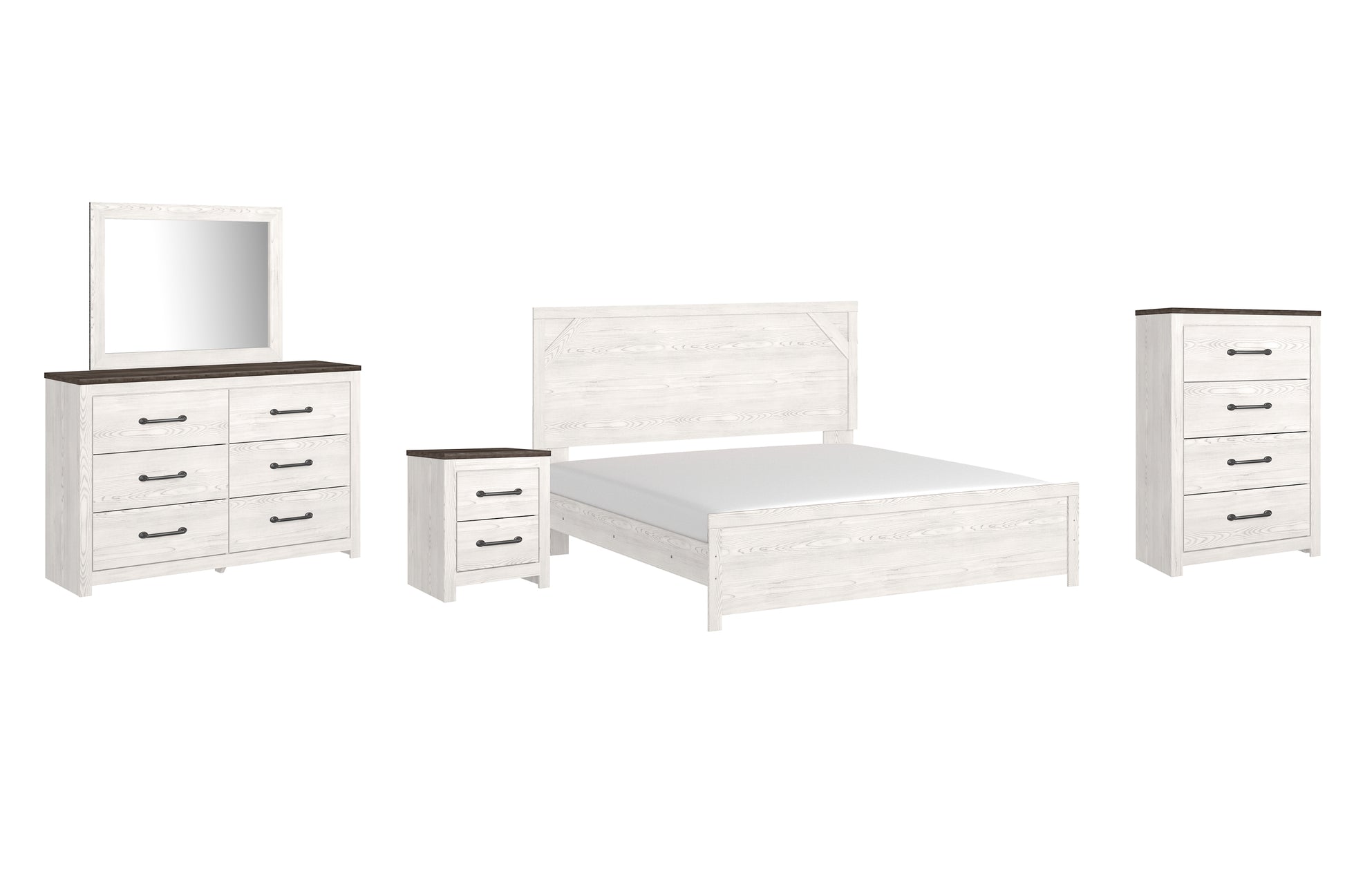 | Details | B1190B3: Includes headboard, footboard and rails, Made of engineered wood (MDF/particleboard) and decorative laminate, White rustic finish with replicated cedar grain, Foundation/box spring required, sold separately, Mattress not included, sold separately, Assembly required, Bed is compatible with an adjustable base, B1190B1: Includes dresser with mirror, Made of engineered wood (MDF/particleboard) and decorative laminate, White rustic finish with replicated cedar grain, Rustic gray planked replicated oak grain with authentic touch, 6 smooth-gliding drawers with faux linen lining, Large scale dark colored handles, Mirror attaches to back of dresser, Assembly required, B1190-44: Made of engineered wood (MDF/particleboard), and decorative laminate, White rustic finish with replicated cedar grain, Rustic gray planked replicated oak grain with authentic touch, 4 smooth-gliding drawers with faux linen lining, Large scale dark colored handles, Safety is a top priority, clothing storage units are designed to meet the most current standard for stability, ASTM F 2057 (ASTM International), Drawers extend out to accommodate maximum access to drawer interior while maintaining safety, Assembly required, B1190-92: Made of engineered wood (MDF/particleboard), White rustic finish with replicated cedar grain, Rustic gray planked replicated oak grain with authentic touch, 2 smooth-gliding drawers with faux linen lining, Large scale dark colored handles, Assembly required, | |