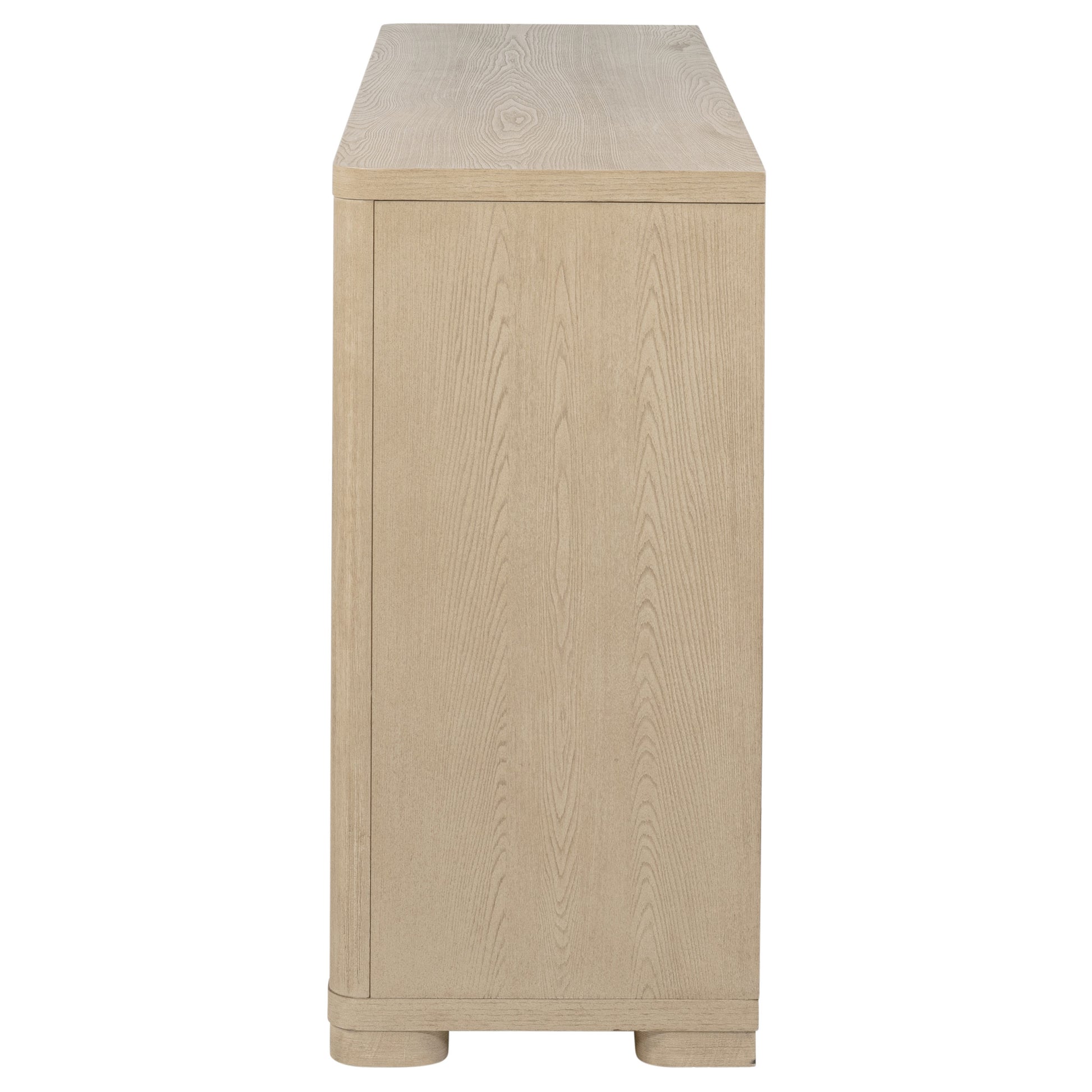 This contemporary six-drawer dresser is designed with clean lines and a light elm finish to complement modern spaces. Brushed nickel fingertip pulls and rounded corners add subtle refinement. The extra-large drawers feature tinted interiors, French dovetail fronts, and English dovetail backs for superior durability. Smooth metal glides ensure reliable performance, making this dresser a stylish and functional addition to any bedroom.