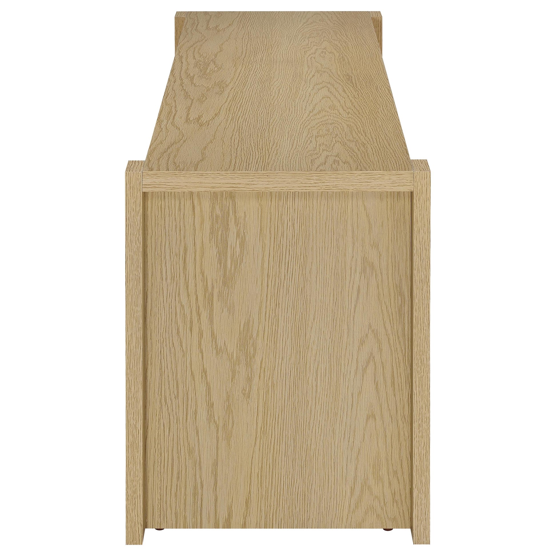 • TV stand with open shelving and two hidden compartments in a light oak woodgrain finish