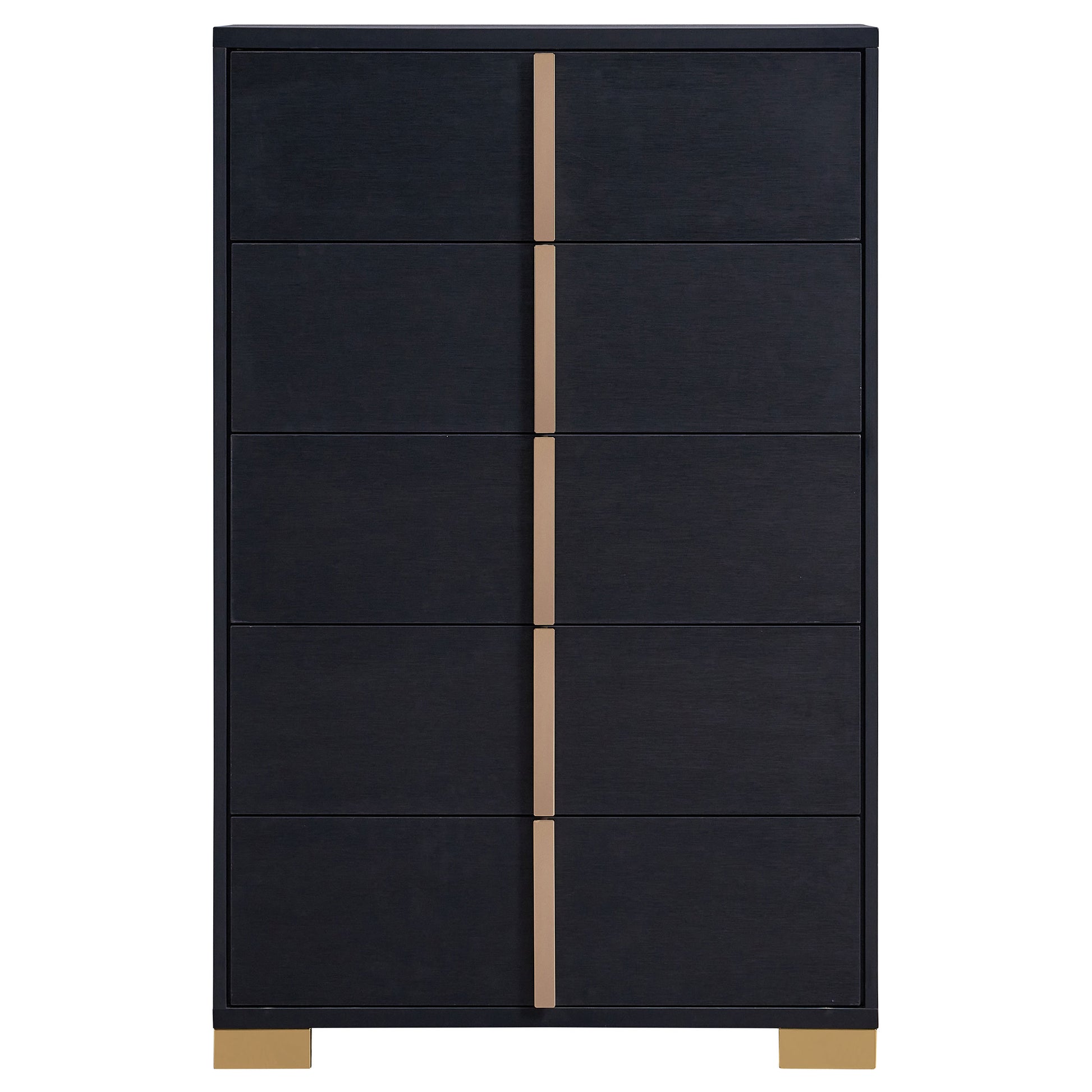 Minimalism never looked so elegant as it does in this elegant five-drawer chest, an excellent option for your updated bedroom ensemble. Modern design details produce a chic vertical chest with an Art Deco vibe and tons of storage space. Made of wood products, this five-drawer chest features a versatile finish with accenting from gold finish metal, placed carefully to emphasize a geometric linear effect. Store incidentals and accessories in drawers operating smoothly on center metal glides. English dovetail drawer construction embellishes this chest’s quality, as vertical gold metal drawer hardware offers a unique impact.