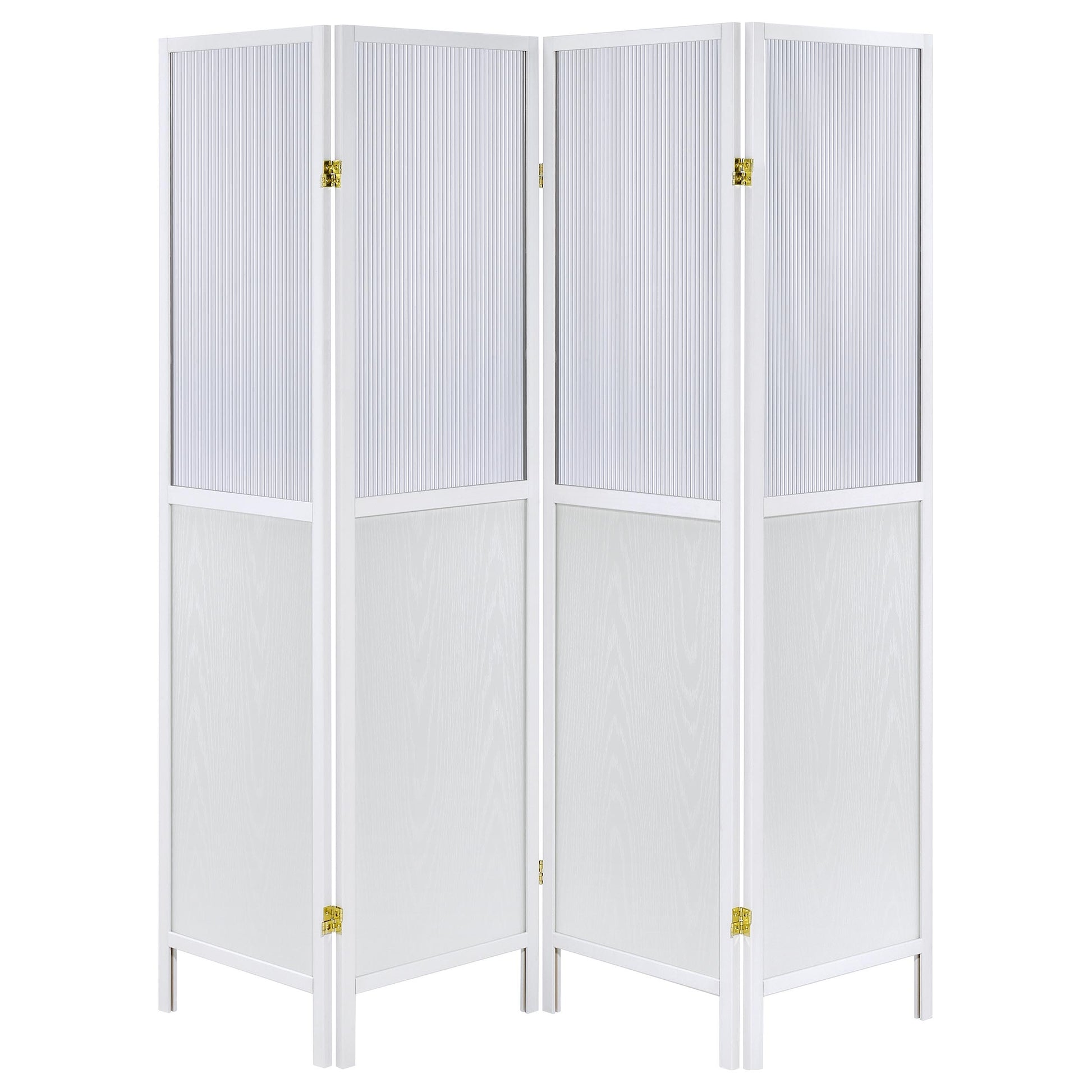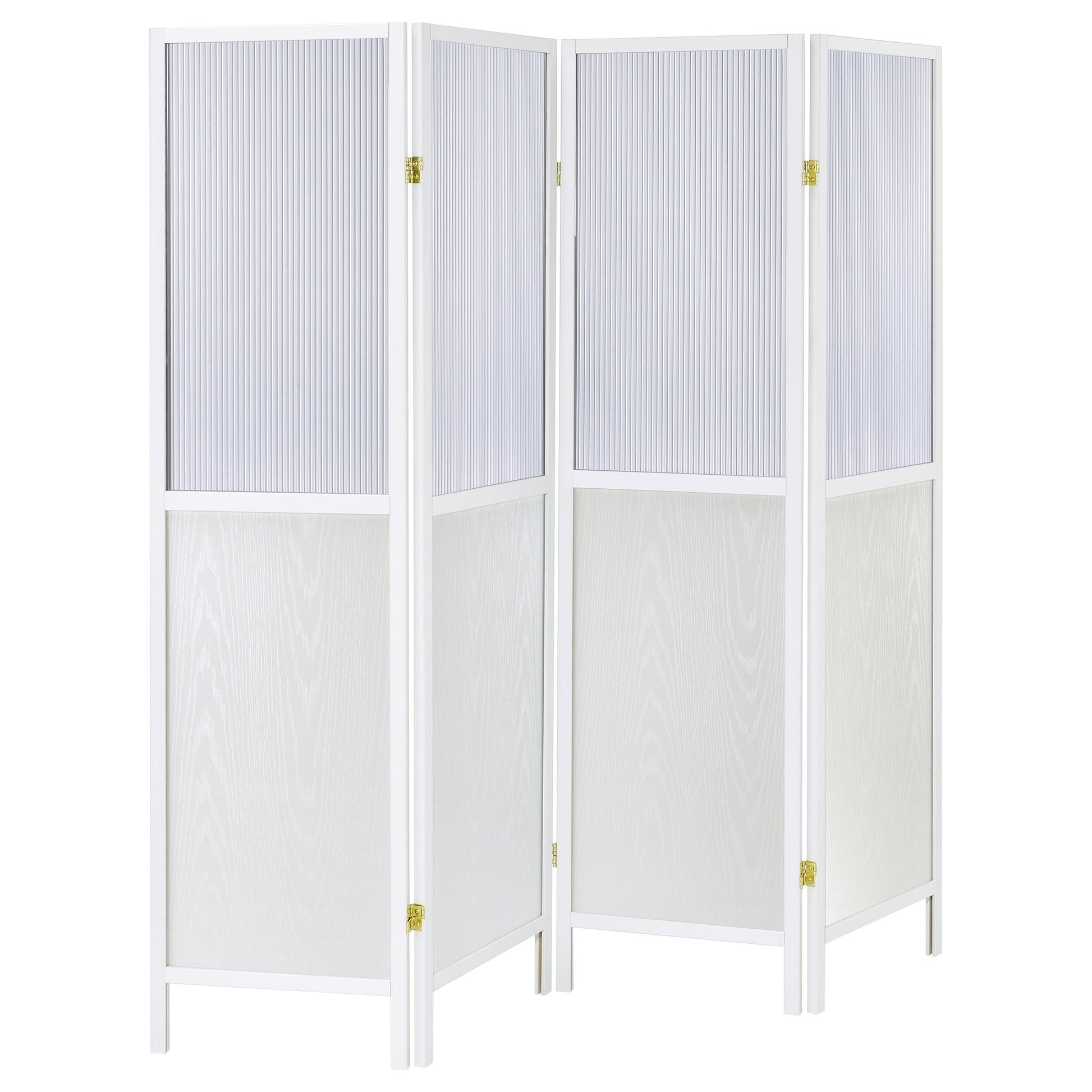 Create the perfect sense of division in your open living space with a transitional four-panel room divider. The freestanding piece offers four tall panels, each divided with a semi-opaque top section that allows light to pass through. The panels are ideal for a large primary suite, creating a sense of privacy for dressing or to section off a desk. The frame of each panel features a neutral finish and a solid lower panel for excellent performance and privacy. The lower panels includes a wood grain finish that's subtle, offering a touch of dimension to any room.