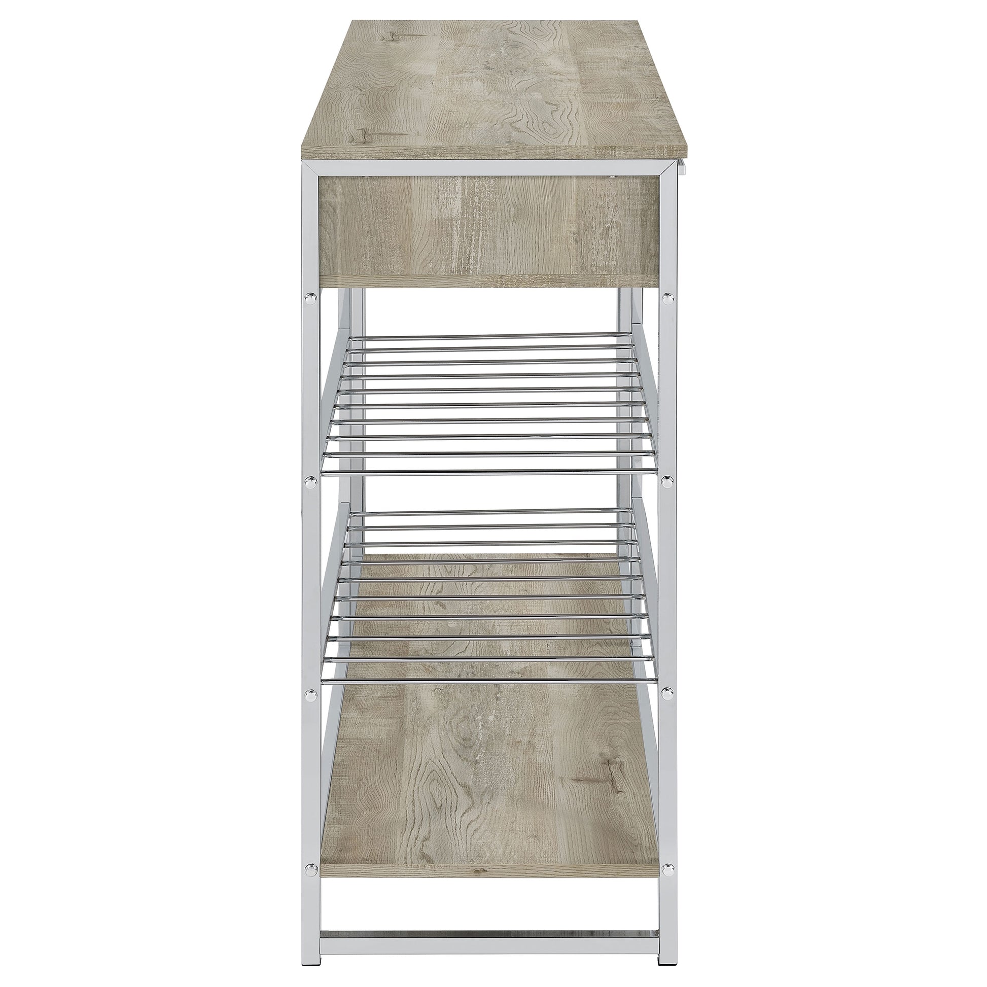 Your entertaining needs are filled with a sense of casual style and supreme organization as this wine cabinet provides space and configuration for a casual space. Make serving a breeze with a cabinet featuring gray finish wood products construction of an upper two-drawer cabinet and matching lower shelf. Minimalist metal framing adds a great optical benefit, with two slat shelves that accommodate dishware and stemware. Drawers open easily to make space for implements. This all-in-one bar cabinet offers a fresh, clean look and lots of convenience to organize an entertainment regimen.