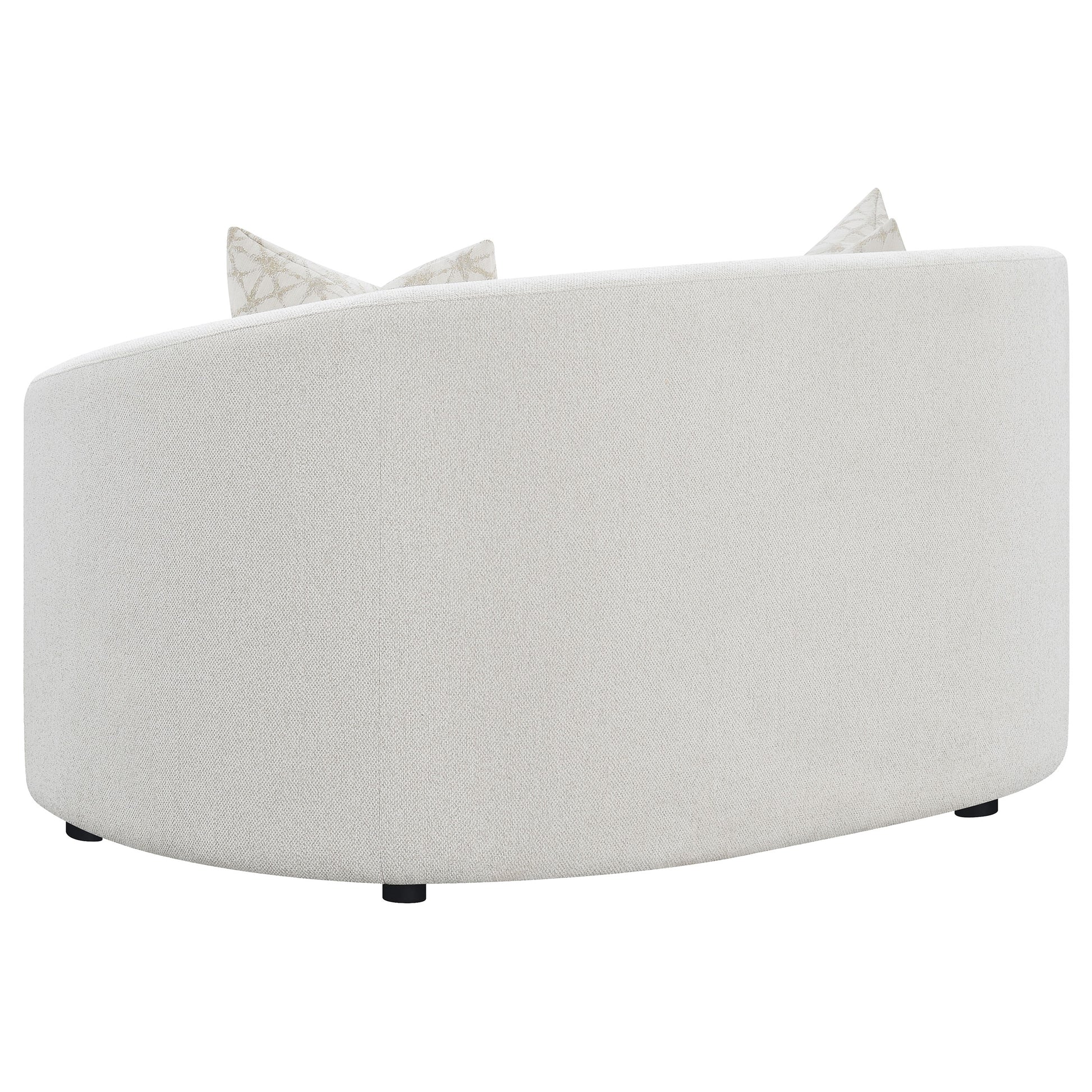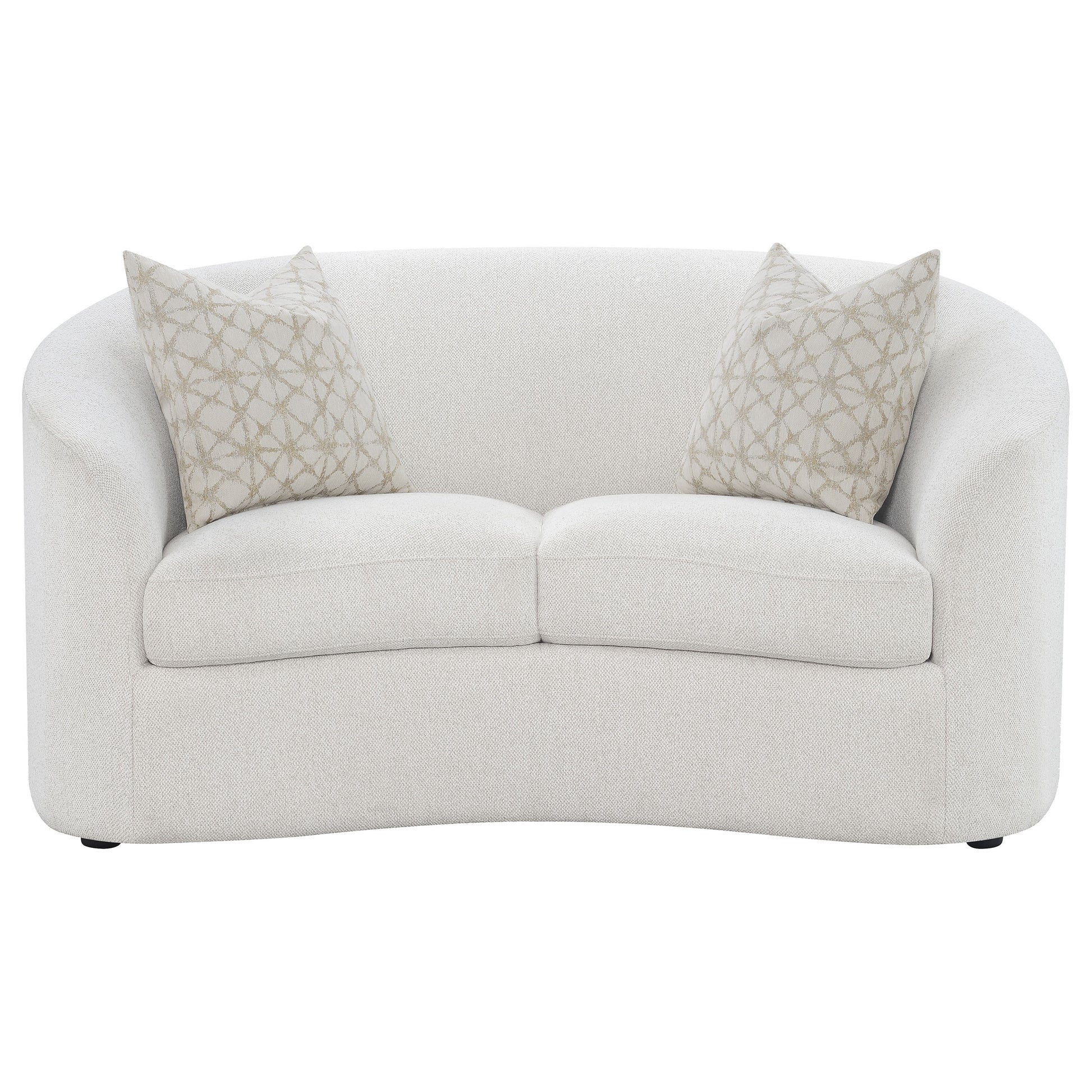 The living room set captures the perfect balance of modern warmth and sculptural design. Each piece is wrapped in soft latte boucle upholstery, creating a cozy yet elevated texture. Curved silhouettes and sloped armrests lend a contemporary feel, while plush cushions and tailored backs ensure enduring comfort. Accent pillows with faux down fill add inviting softness and refinement. Blending timeless craftsmanship with modern aesthetics, this collection transforms any living space into a serene and stylish retreat.