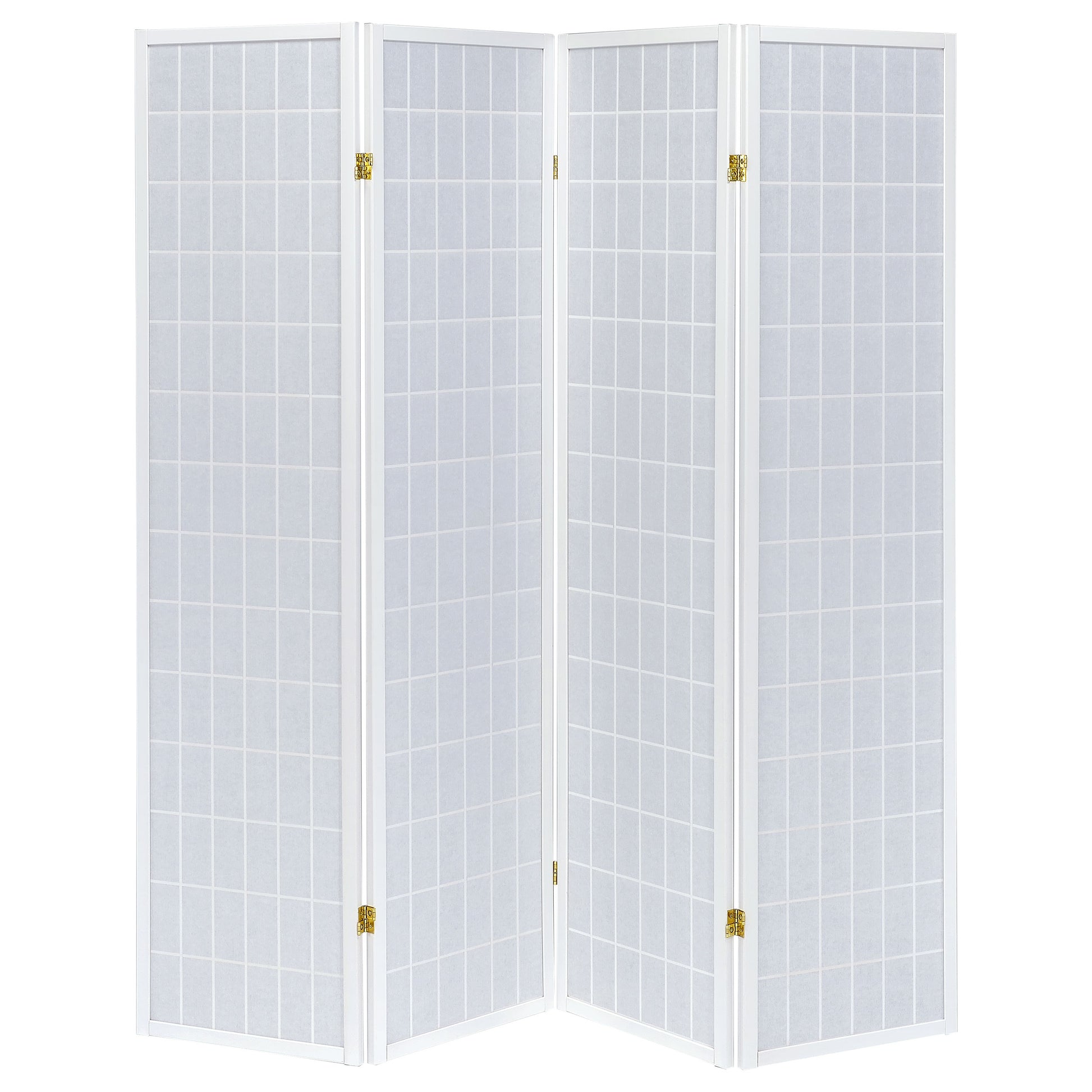 • Four-panel folding room divider in white with contemporary grid motif