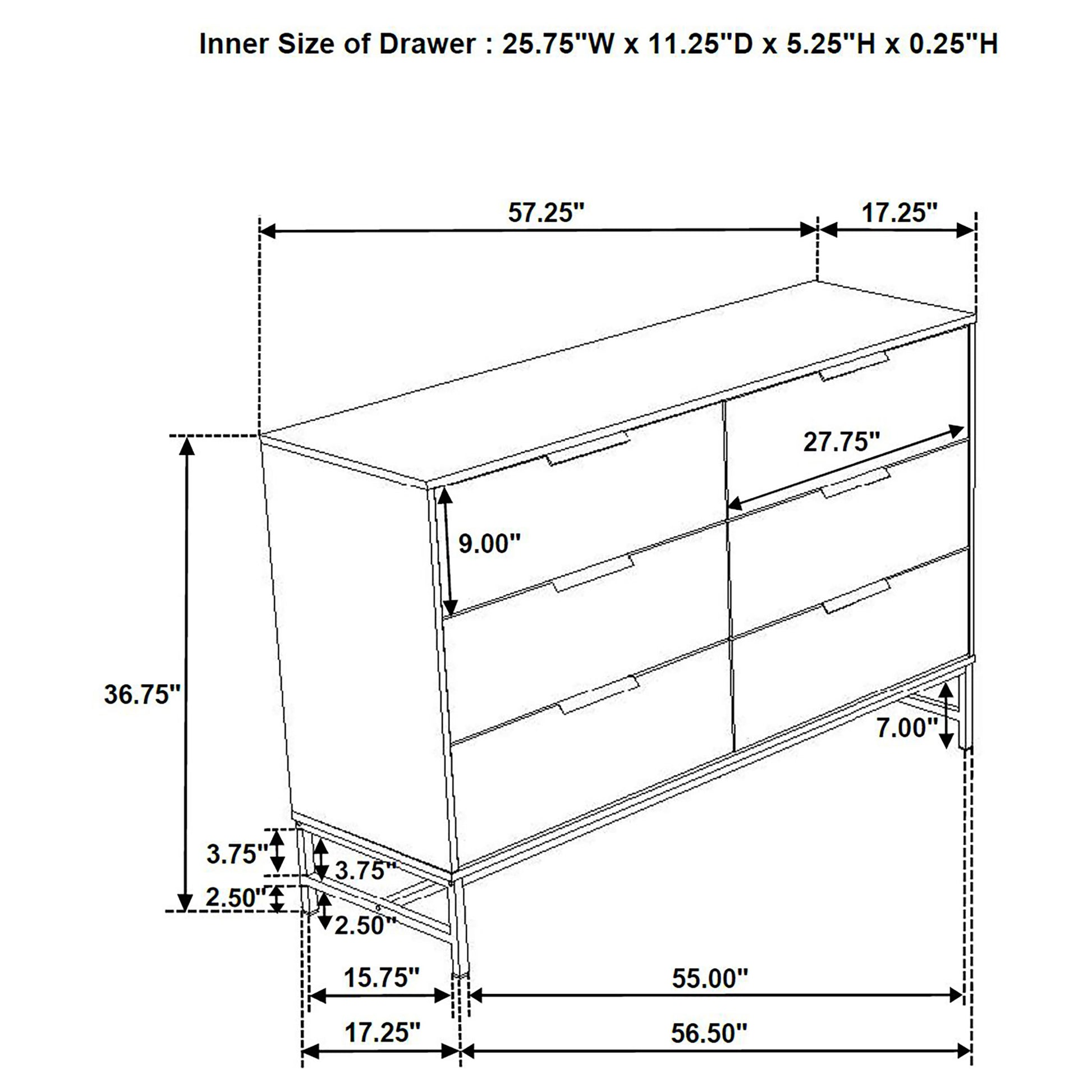 • Dresser and mirror offer six roomy drawers with black finish bar pulls and base