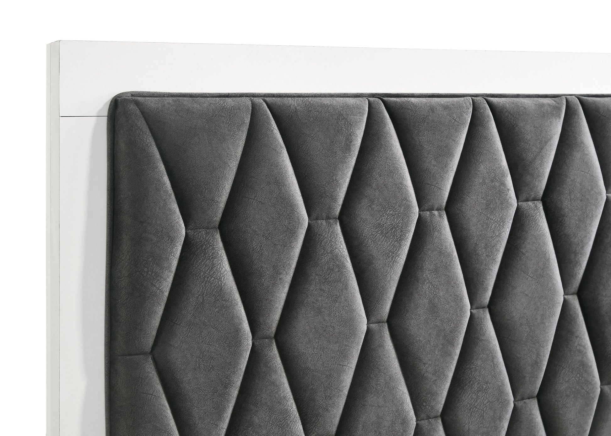 Delivering the perfect mix of style and functionality, this five-piece modern bedroom set centers on an upholstered bed and includes a nightstand, chest, and dresser and mirror. Delivering a bright white finish, the set offers light, airy ambiance, perfect for an open bedroom design. The bed boasts a padded headboard complete with hexagonal tufting in dark gray fabric upholstery. The low footboard adds to its open presentation while black accents coordinate with storage pieces that feature long bar handles on drawers. Offering plenty of space for clothing and accessories, the set creates clean, crisp aesthetics in your stylish bedroom.