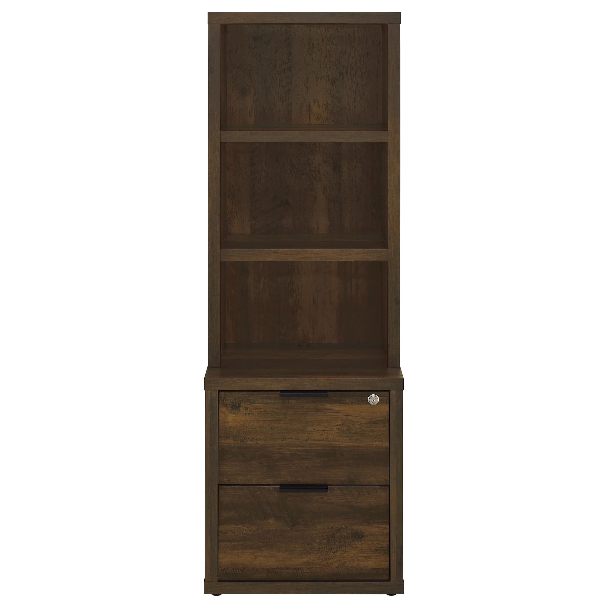 This 3-piece bookcase set brings flexible storage and charging convenience to your living space or home office. Each unit combines open shelving and drawer storage with a locking top drawer and built-in USB-A and USB-C charging ports. Designed as a cohesive wall unit, it functions as a modular bookcase, storage tower, or display shelf. Finished in a scratch-resistant laminate veneer over engineered wood, this multifunctional wall system adapts easily to a variety of rooms and layouts.